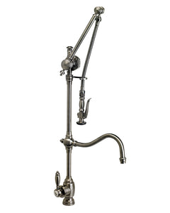 - So what's a Gantry Faucet That's what your friends will ask when they see this incredible centerpiece of your kitchen. How do you explain it when there is nothing else out there like it It is unique in both design and functionality. The Waterstone Gantry's patented design was modeled after the massive size and strength of Gantry cranes in U.S. harbors and ship yards. Gantry cranes do the heavy lifting when it comes to unloading cargo from ships. The faucet's pre-rinse spray arm is spring loaded and has a range of motion to reach every corner of your sink. The 360 degree hook swivel spout does the job too. Single handle can be mounted with handle in front, right or left hand positions. The traditional Gantry's distinctive look and ornate design will definitely get them talking. Handle adjusts for clearance from backsplash. Three decorative handle caps included. Compatible with reverse osmosis filtration systems.