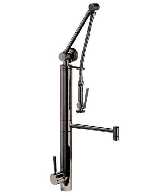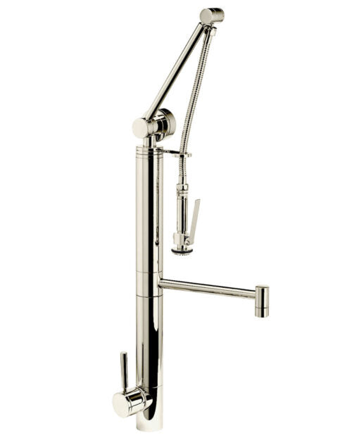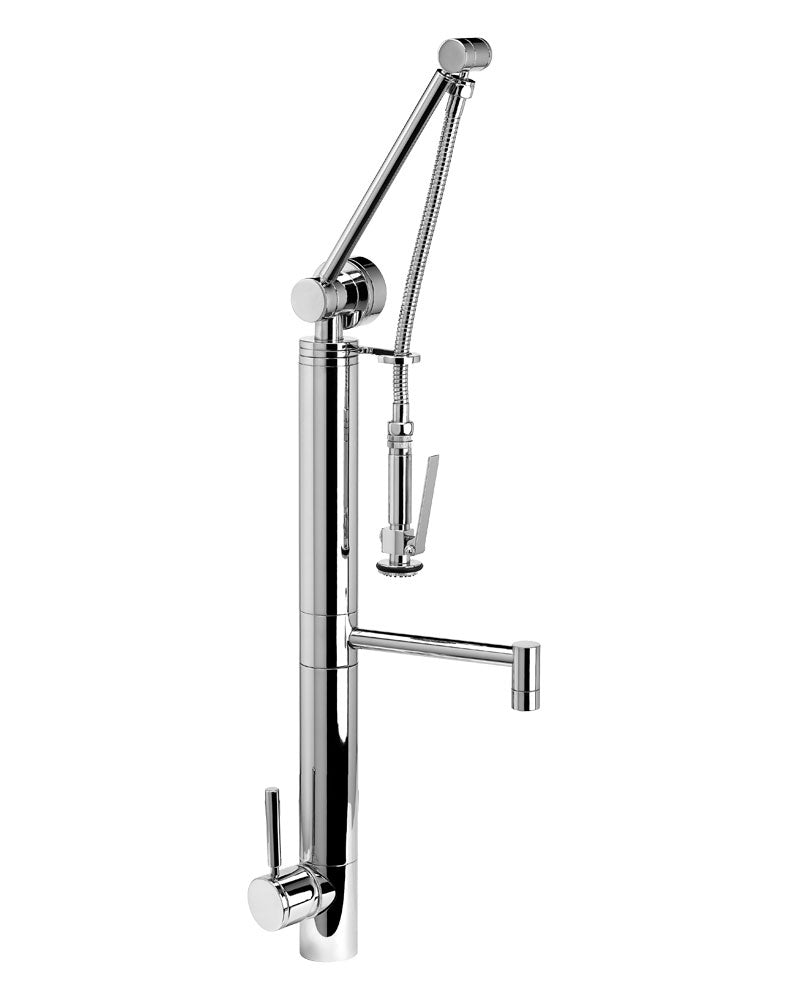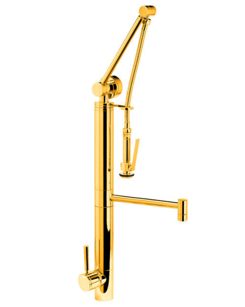 - So what's a Gantry Faucet That's what your friends will ask when they see this amazing centerpiece of your kitchen. How do you explain it when there is nothing else out there like it It is unique in both design and functionality. The Waterstone Gantry's patented design was modeled after the massive size and strength of Gantry cranes in U.S. harbors and ship yards. Gantry cranes do the heavy lifting when it comes to unloading cargo from ships. The faucet's pre-rinse spray arm is spring loaded and has a range of motion to reach every corner of your sink. The 360 degree straight swivel spout does the job too. Single handle can be mounted with handle in front, right or left hand positions. The contemporary Gantry's modern sleek design will definitely get them talking. Handle adjusts for clearance from backsplash. Compatible with reverse osmosis filtration systems.