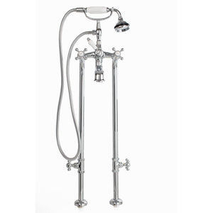 A Free Standing Tub Filler with Hand shower and stop values, it comes with ceramic accents on the leaver and hand shower. Available in 5 finishes with Lever handles.