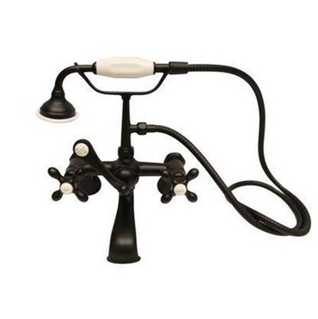 This stylish tub wall-mounted faucet has a telephone style handheld shower, a wide elephant spout and decorative metal cross or lever handles.