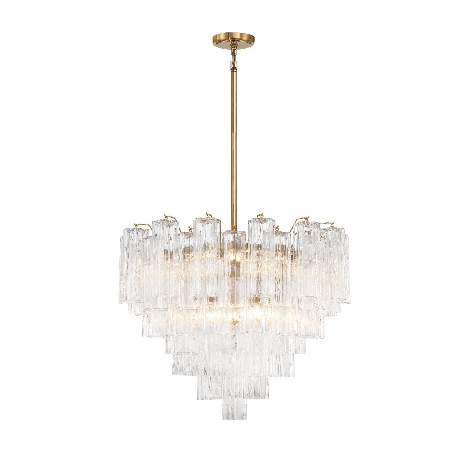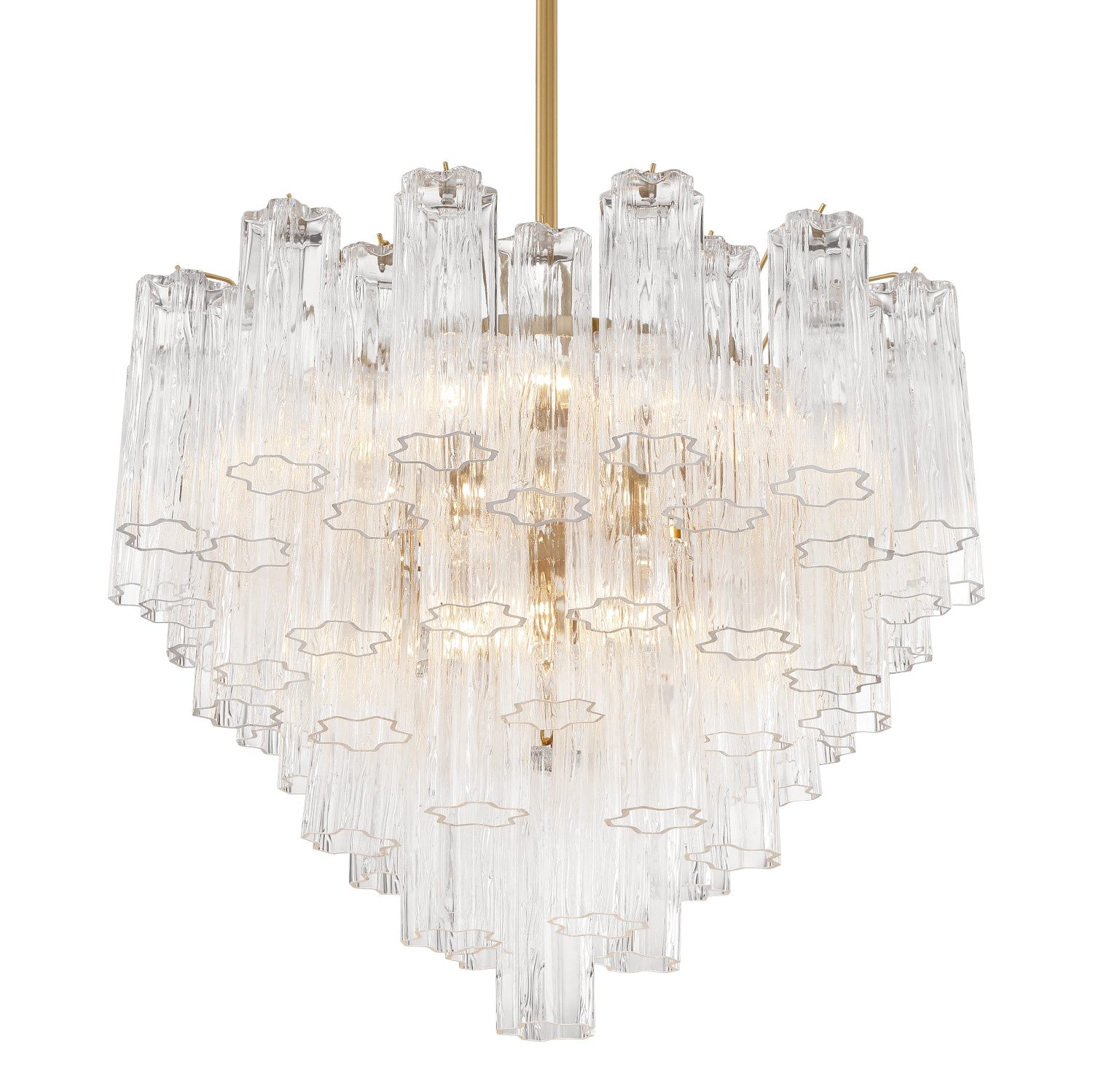 The captivating Addis Lighting Collection is a modern-day interpretation of the iconic mid-century Tronchi chandelier. Inspired by its predecessor's sleek lines and geometric shapes, the Addis features a polished Chrome or Aged Brass metal frame that exudes sophistication and style. Its unique design showcases transparent tiers of textured Tronchi glass tubes, forming a mesmerizing 5-point rounded star shape. Choose from a range of glass colors, including clear, amber, smoke, and white, or the stunning Autumn option, which features a captivating multicolor disposition of amber, clear, and smoke Tronchi glass. The Addis Lighting Collection offers various sizes and finishes, allowing you to find the perfect fit for your space while adding a touch of timeless elegance.