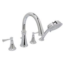 The Woodbury roman tub filler faucet is brilliantly chic. With its detailed handles, high-arc spout and pull-out hand shower, this transitional series offers a touch of classic elegance to any roman tub.