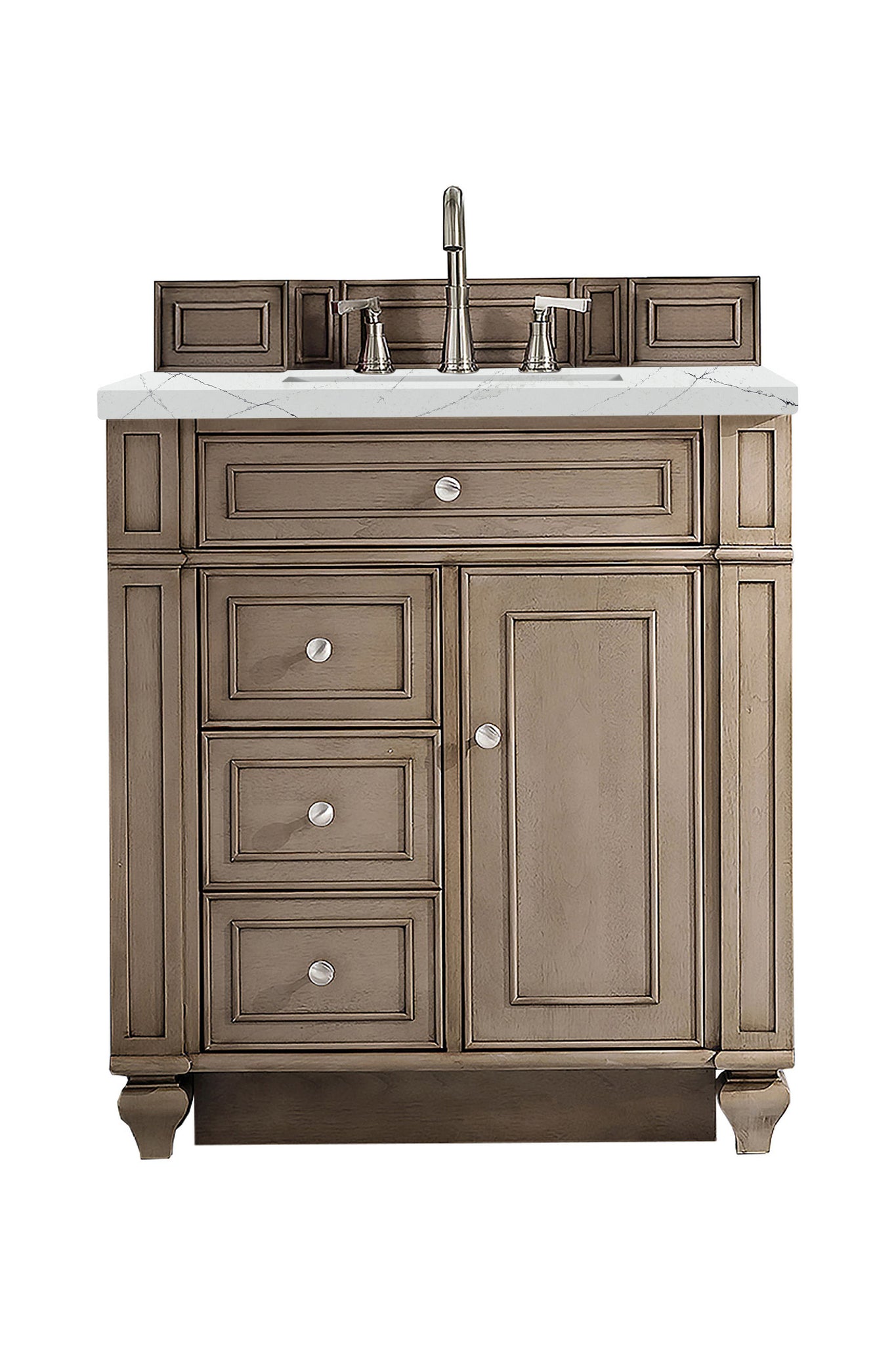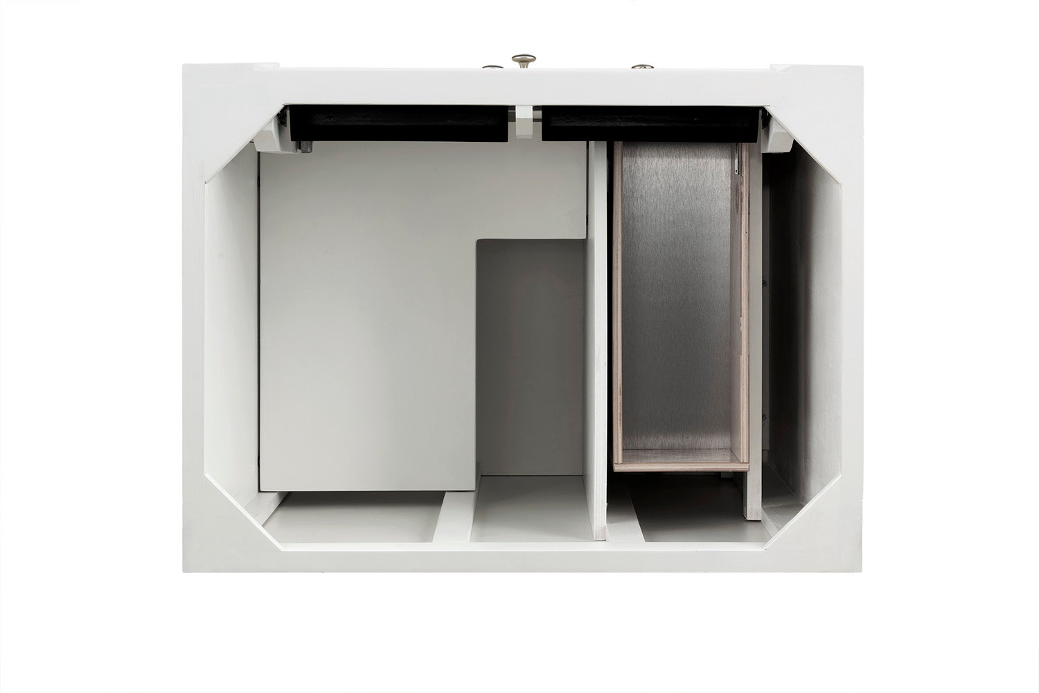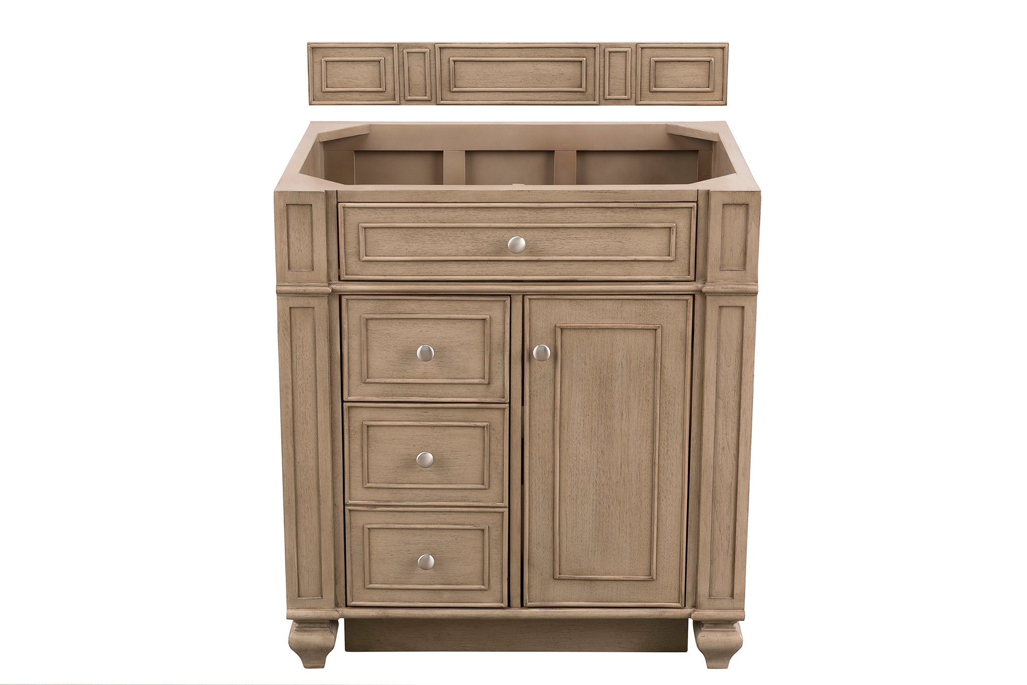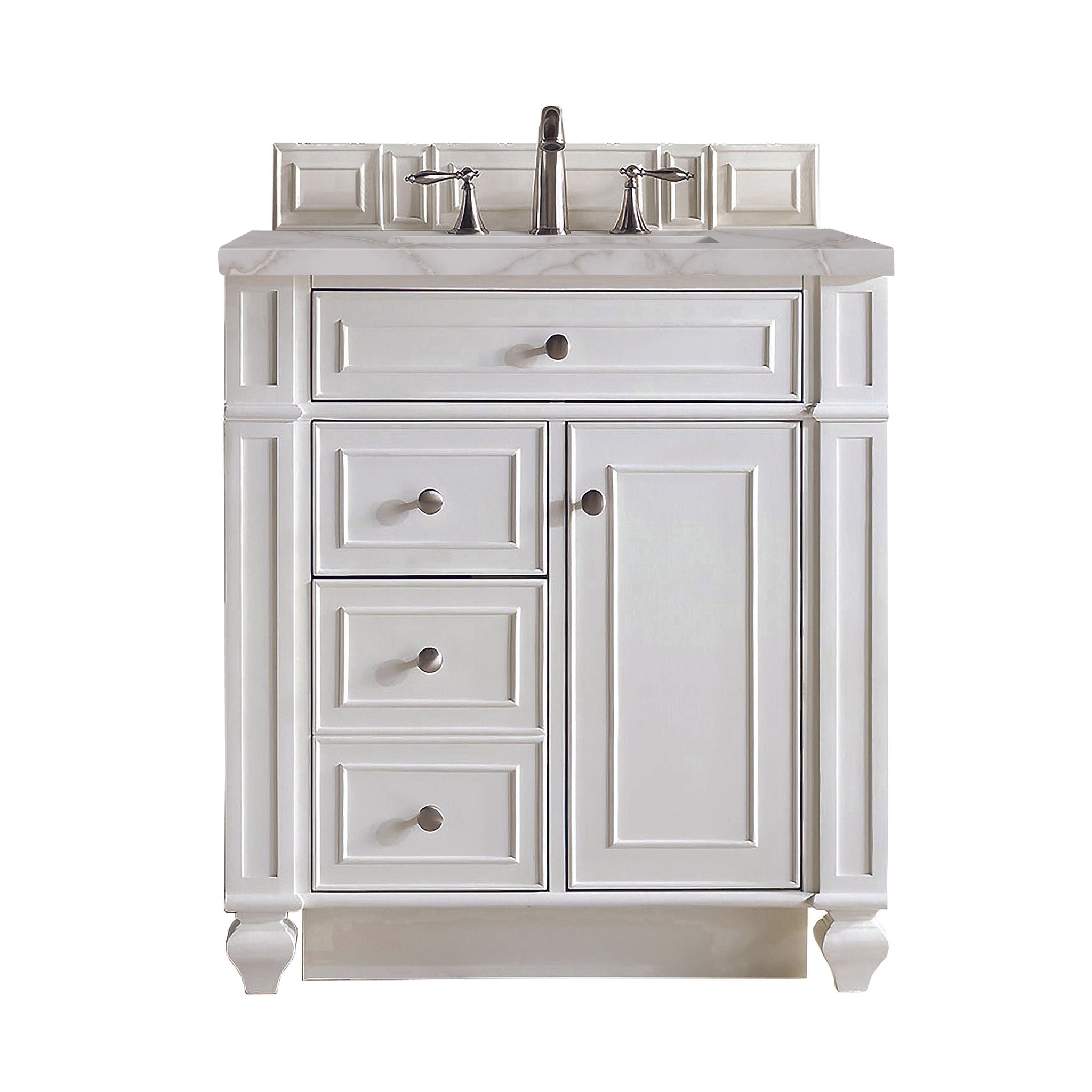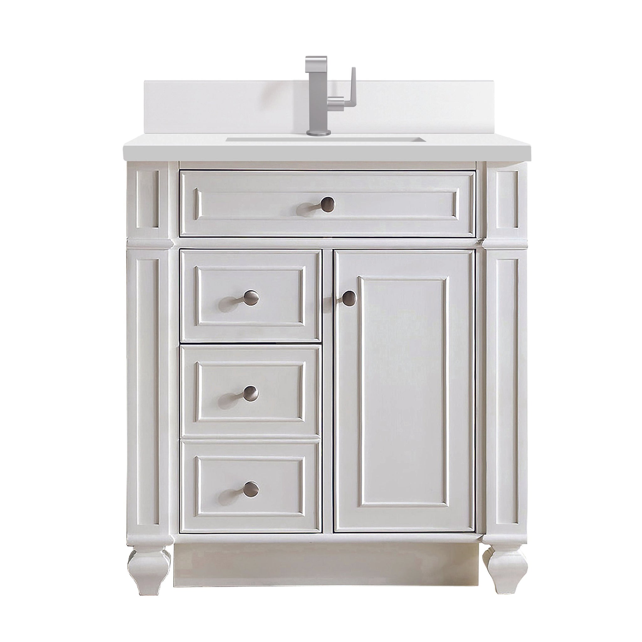 The Bristol 30" Bright White Single Vanity Cabinet features a full plinth base, also known as a toe kick or pedestal base, This wraparound base allows for quick clean ups. This vanity is complimented by Satin Nickel door and drawer pulls, along with an optional wood backsplash.