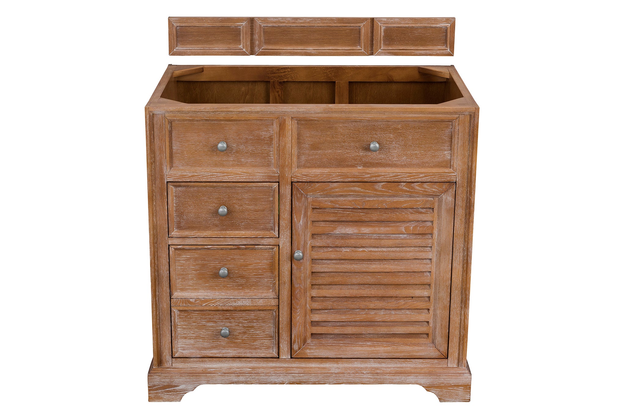 The Savannah 48" Single Vanity Cabinet by James Martin Vanities features a Savannah Shutter-take that can transport you anywhere. From the beach, to the cottage, to the cabin you will feel at home with this beautifully hand crafted piece of furniture as the focal point in your bathroom. door and drawer pulls adorn two doors, with shelves for storage, and three drawers, with the bottom drawer being double height for taller items. Top right drawer is false to allow for sink placement. Matching decorative wood backsplash .