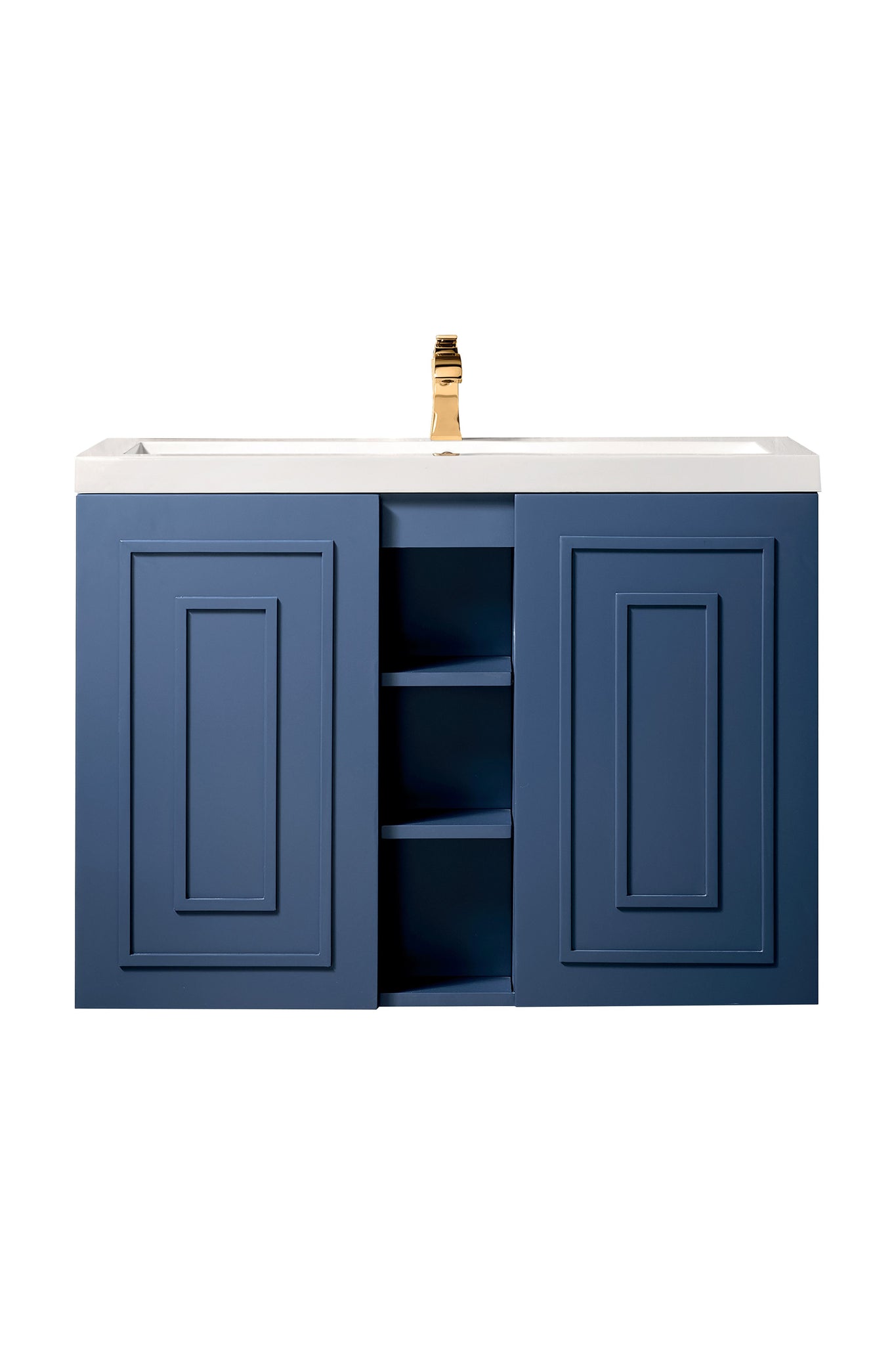 The Alicante 39.5� Azure Blue Single Vanity Cabinet by James Martin Vanities is the perfect choice for any bathroom upgrade. Fine detailing on the frame accents its streamlined appearance. Each door front has framed detailing, adding depth and visual interest to the piece. Keep all your toiletries, makeup and more in this elegant vanity. This vanity features a wall mount design that will help make your bathroom appear larger.
