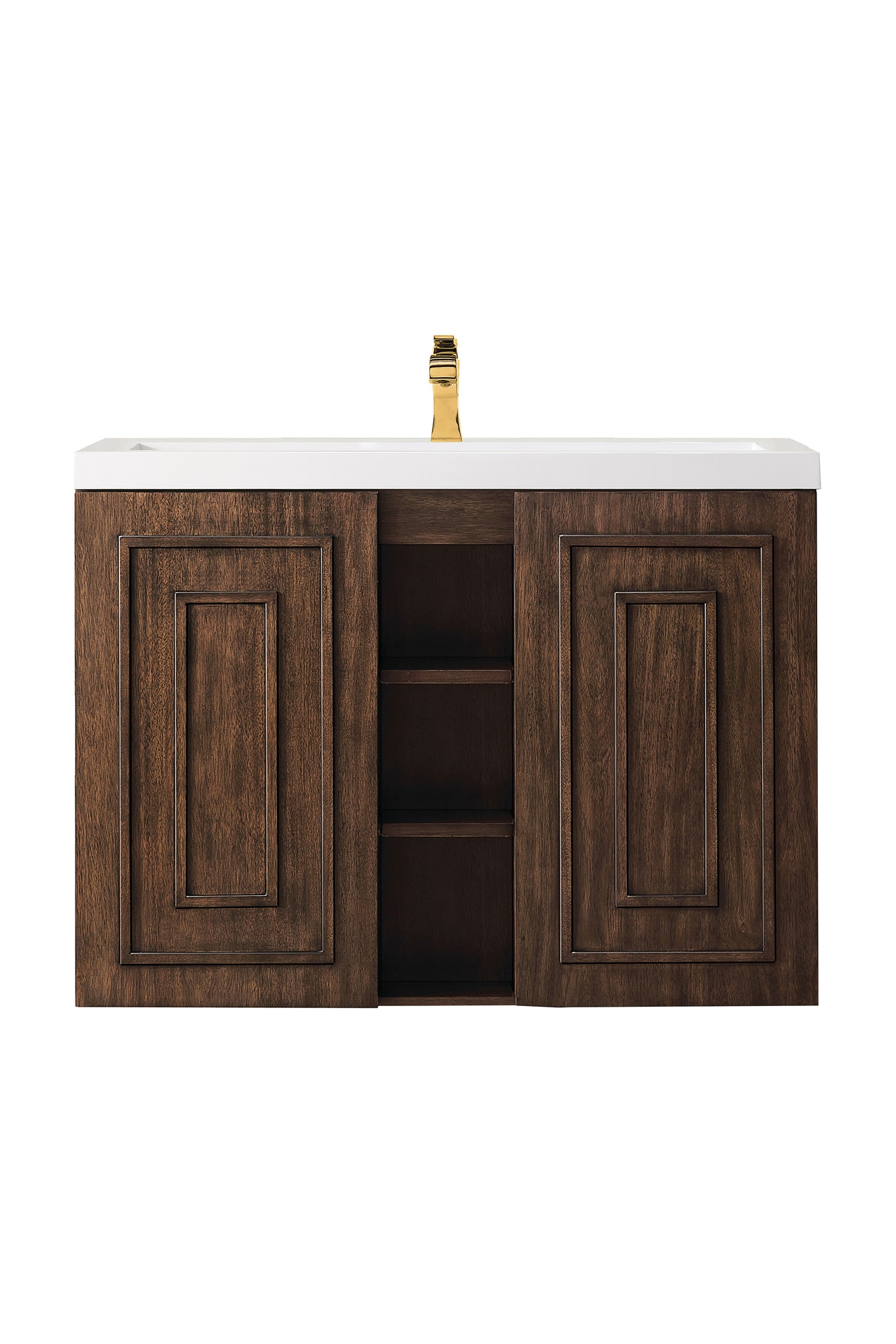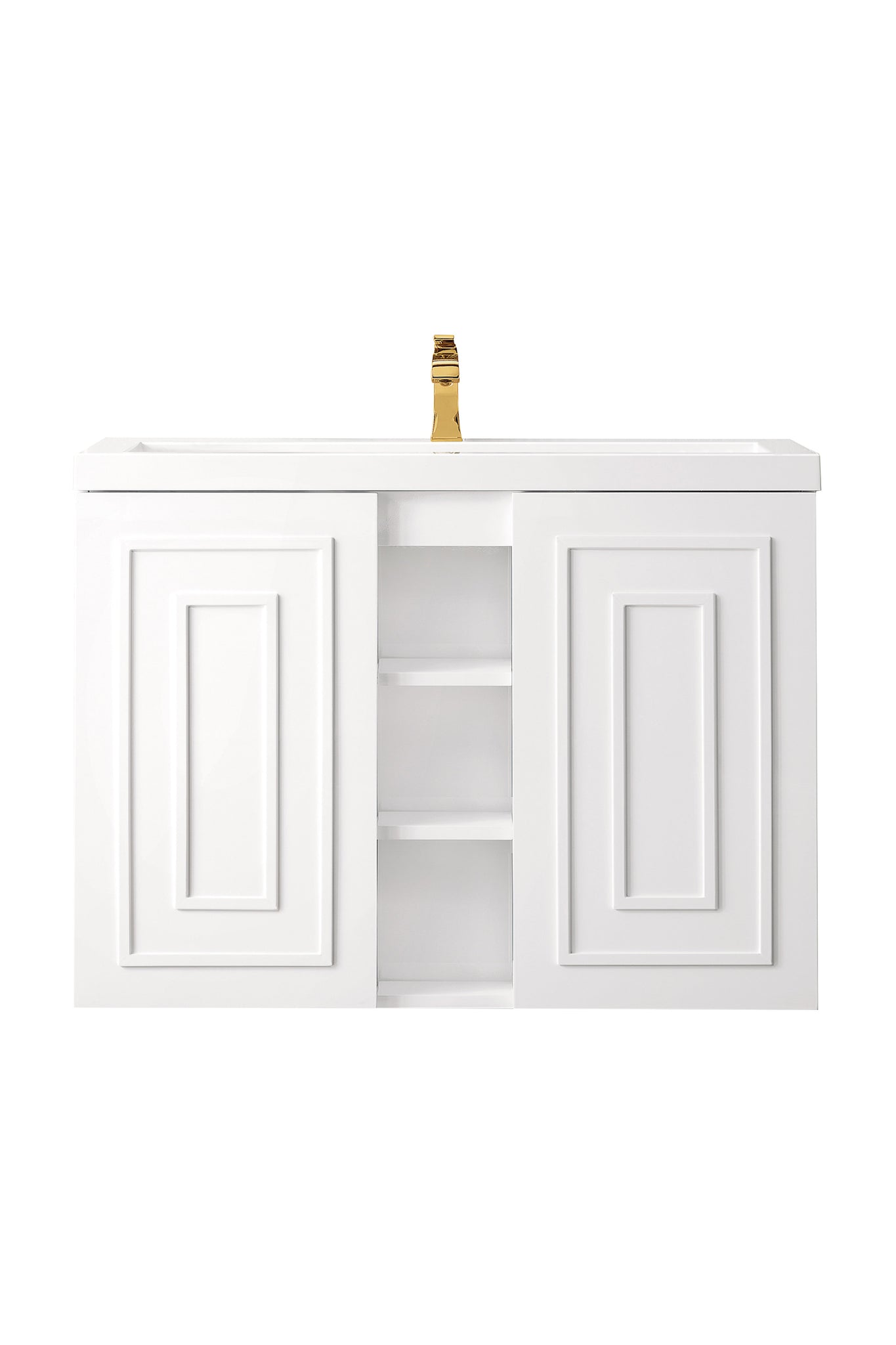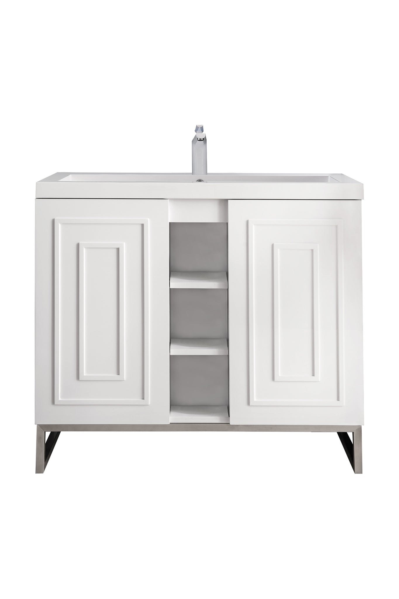 The Alicante collection by James Martin Vanities offers big style in a subtle design. Its sleek metal base and raised panel doors create the perfect modern bathroom vanity. Constructed from fine quality solid hardwoods and comes with our top-rated resin countertop making this piece the epitome of luxury bathroom furniture. It�s timeless and versatile design is accentuated by its beautiful metal base and the vanity was built with external cubbies creating added storage for washroom essentials. This piece also gives you the option to float the look by removing the base. This vanity is sure to illuminate any bathroom with it�s opulent looks.