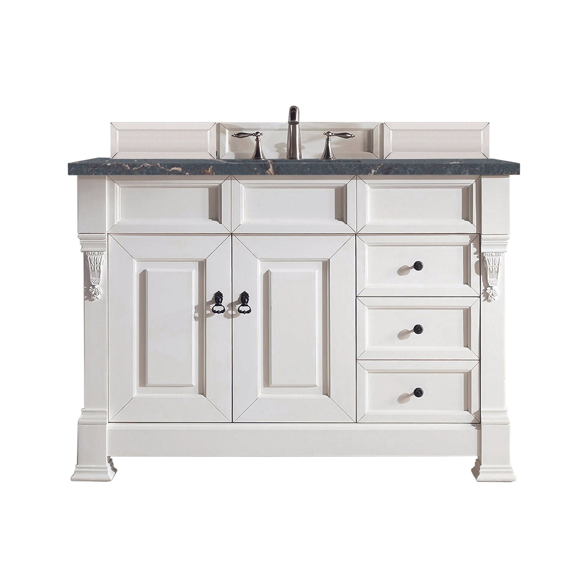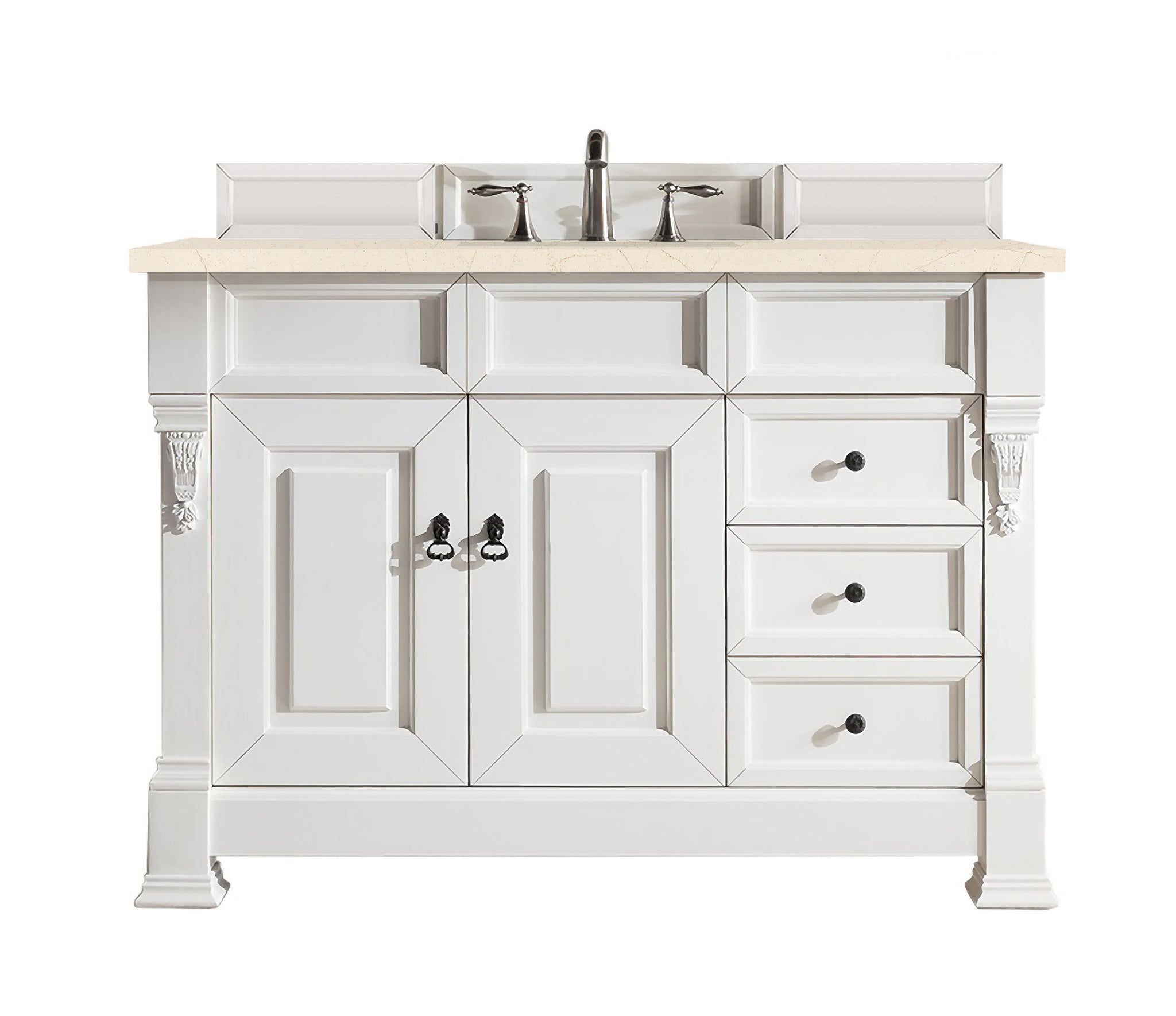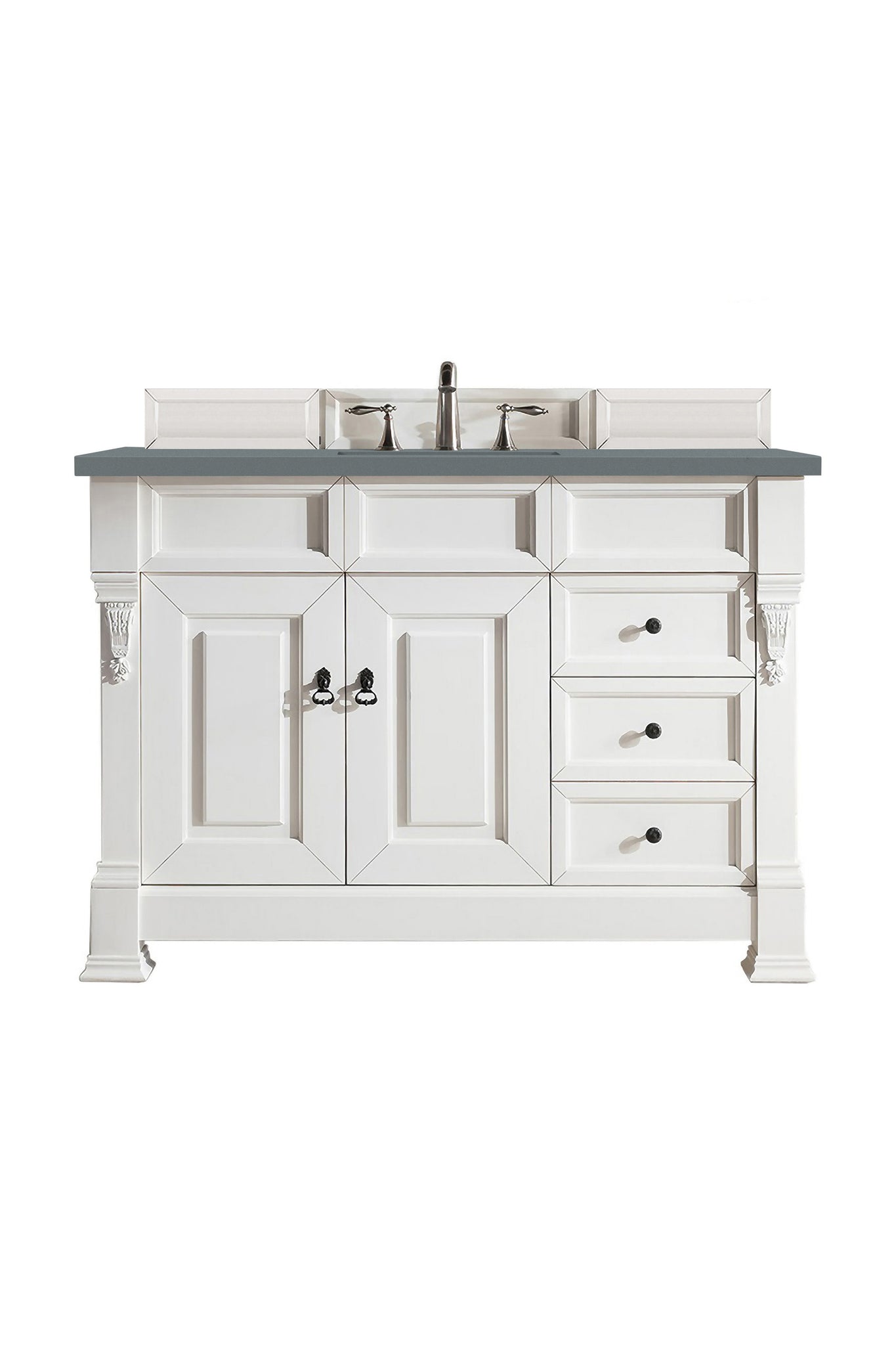 The Brookfield Collection by James Martin Vanities features hand carved accenting filigrees and raised panel doors. Various storage options including doors opening to shelves for storage and drawers. This collection is offered in a variety of finish colors. Each cabinet is configured to work with our variety of 3cm countertops. The look is completed with finish door and drawer pulls. A matching decorative wood backsplash with each cabinet.