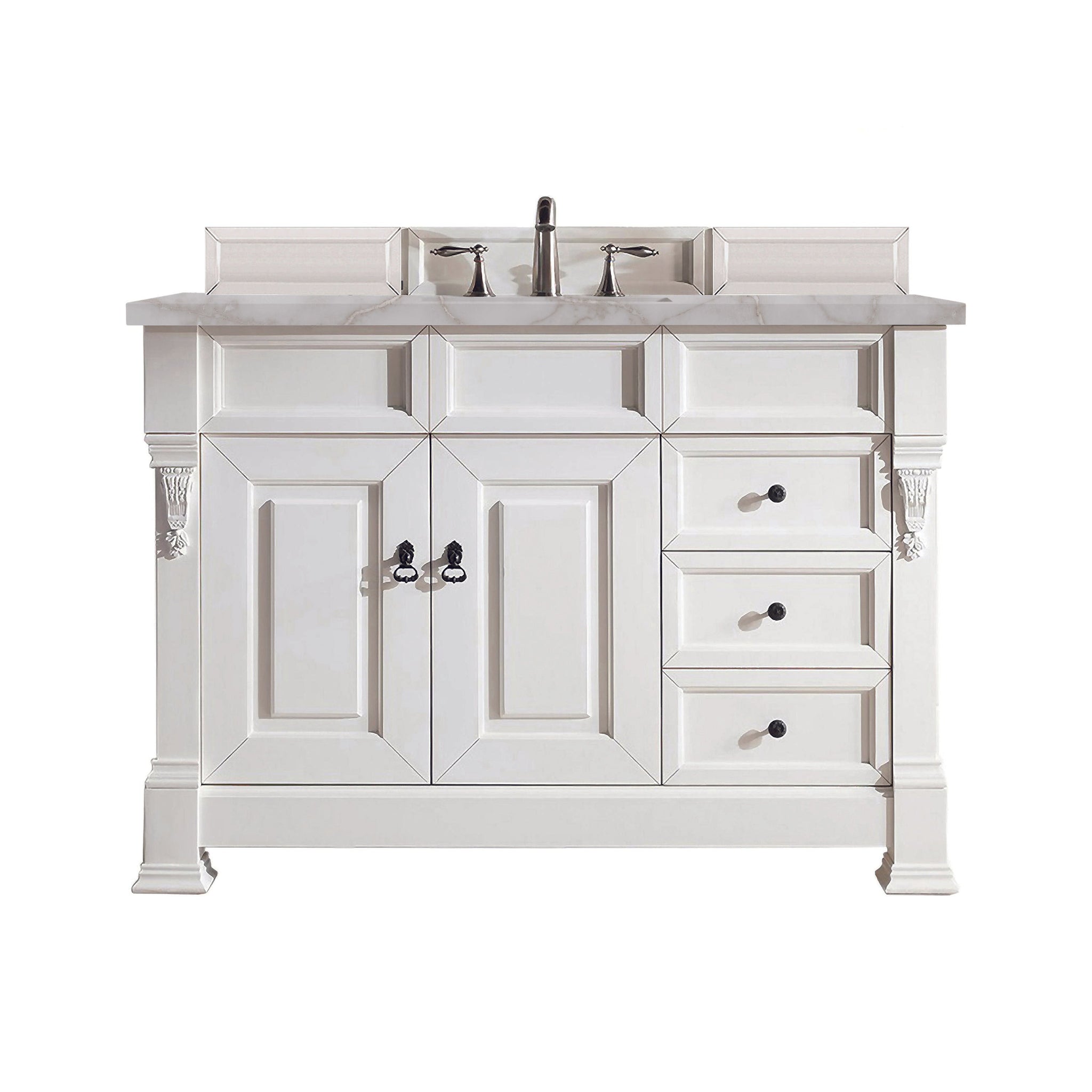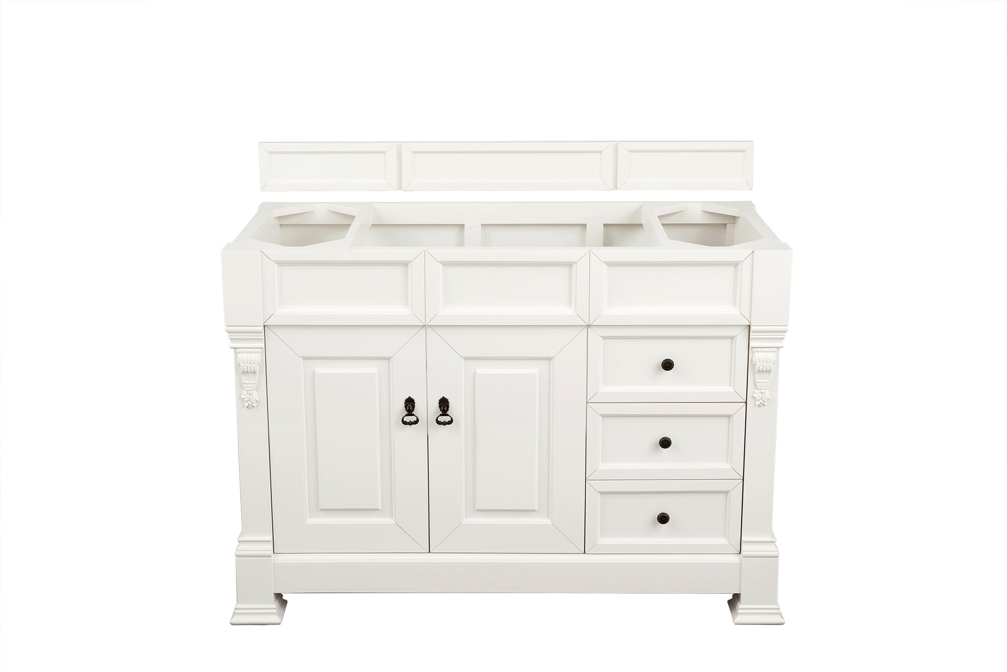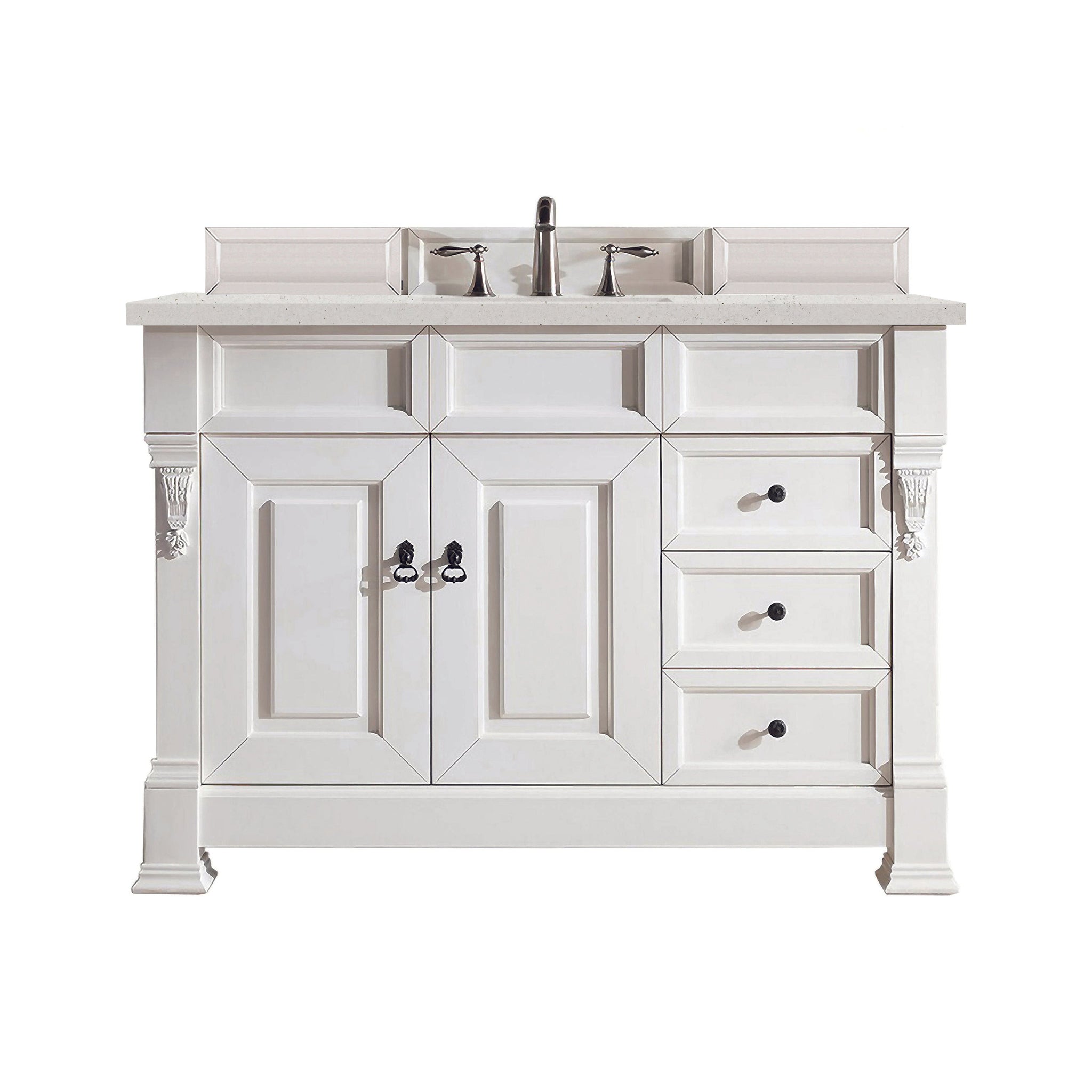The Brookfield Collection by James Martin Vanities features hand carved accenting filigrees and raised panel doors. Various storage options including doors opening to shelves for storage and drawers. This collection is offered in a variety of finish colors. Each cabinet is configured to work with our variety of 3cm countertops. The look is completed with finish door and drawer pulls. A matching decorative wood backsplash with each cabinet.