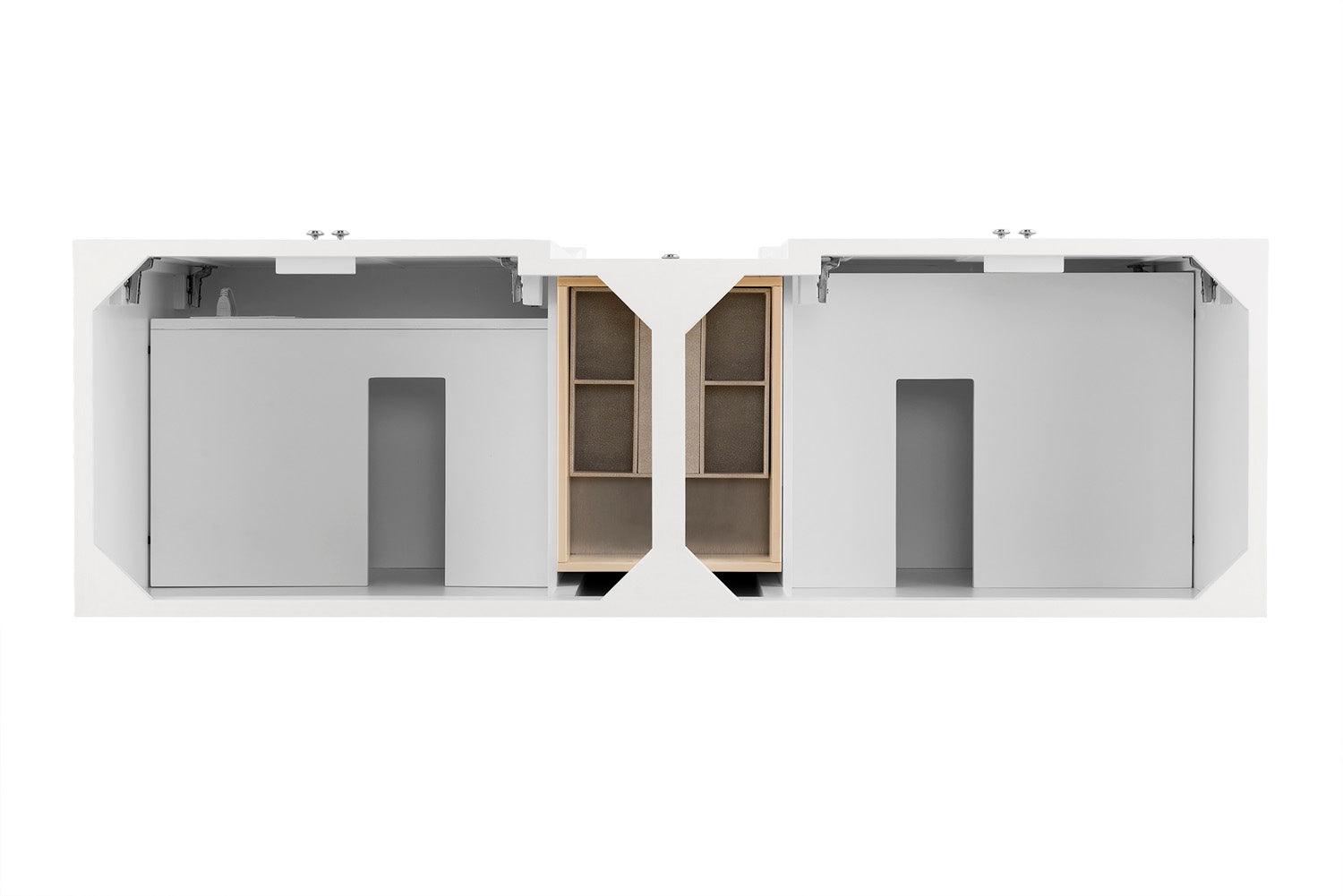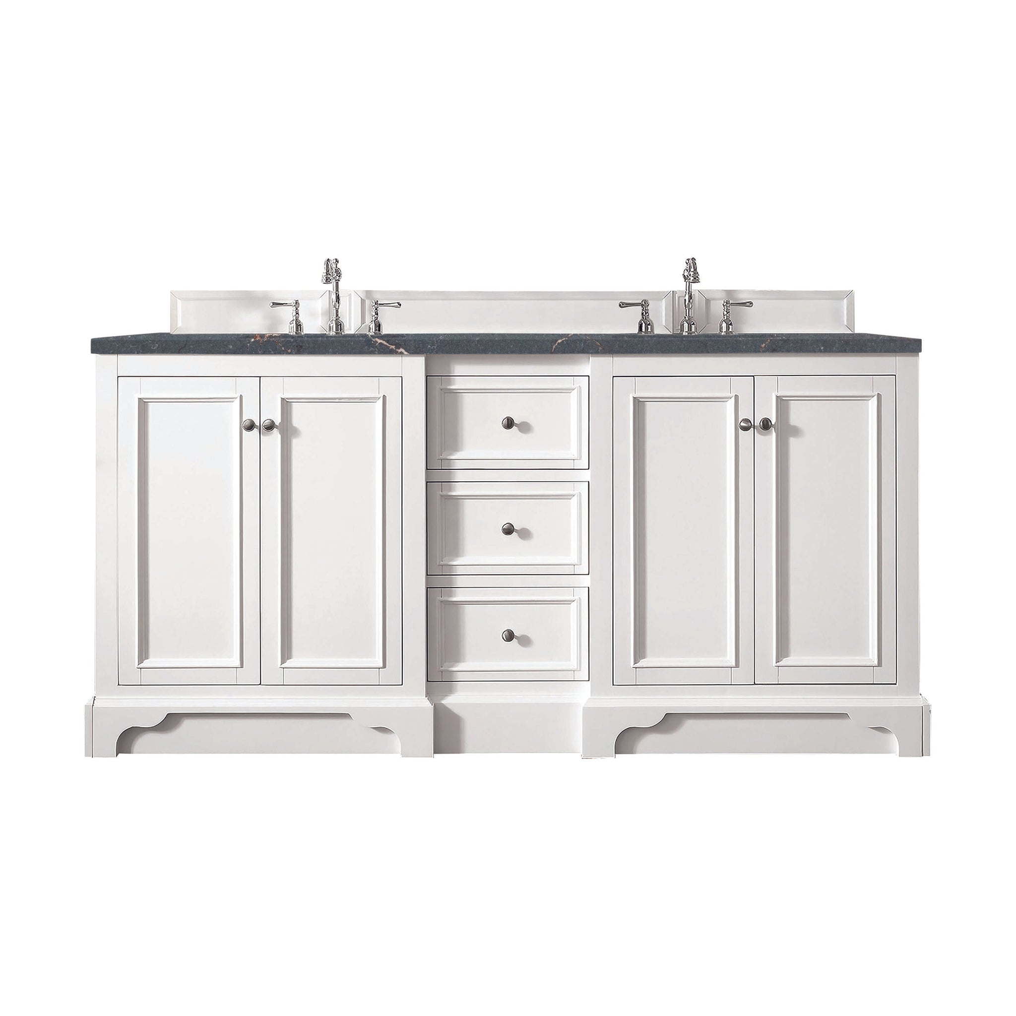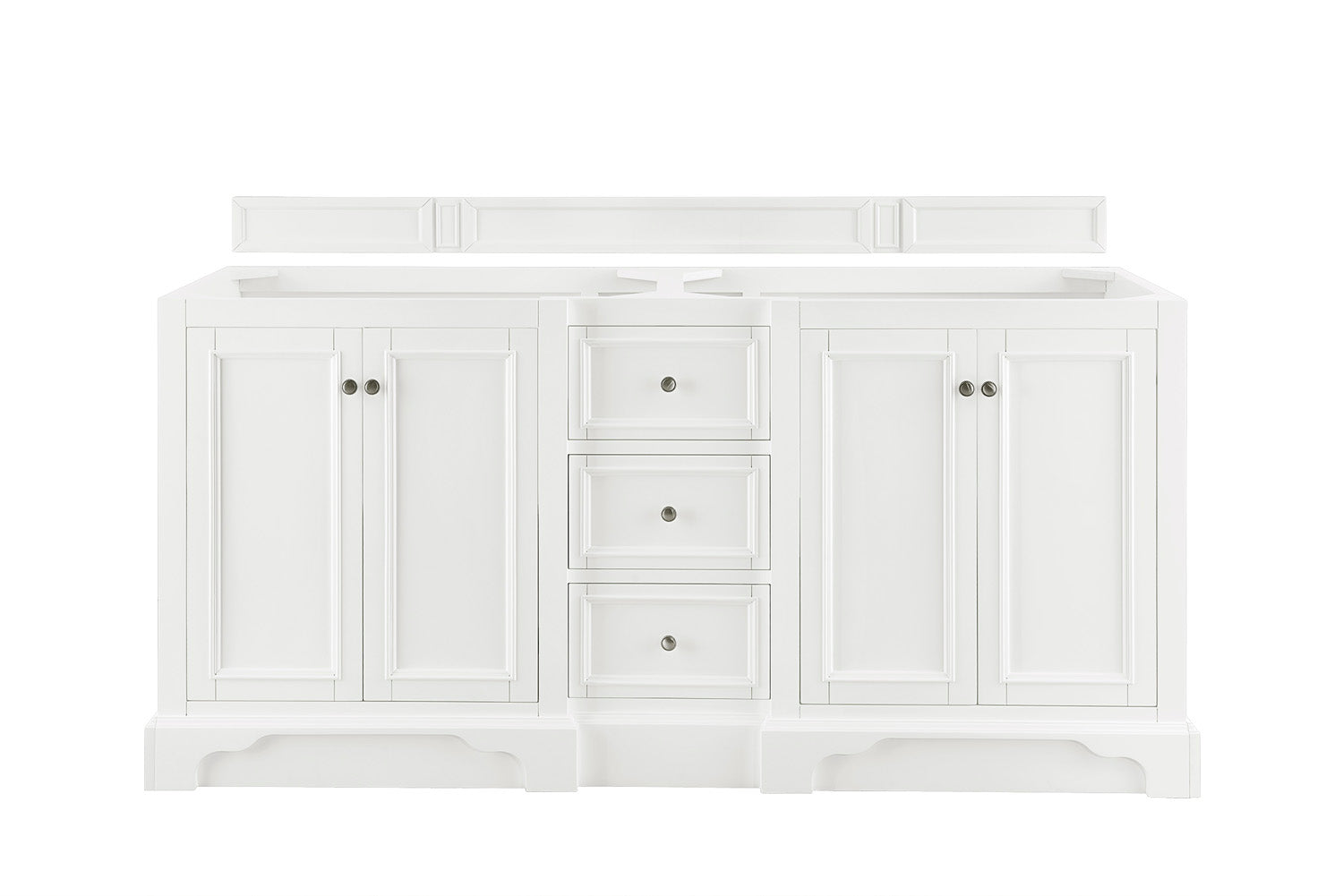 The De Soto 60" Double Vanity was designed to fulfill a wide range of tasks. Storage and convenience are foremost in this collection. The De Soto series provides ample storage in each of the six available widths and configurations. Cabinets are crafted from North American yellow poplar hardwoods and veneers. Low maintenance is provided with the full plinth base located behind the rounded bracket feet. Premium features in this series include an electrical and USB outlet and beautiful faux- drawer organizers. Optional wood backsplash included.