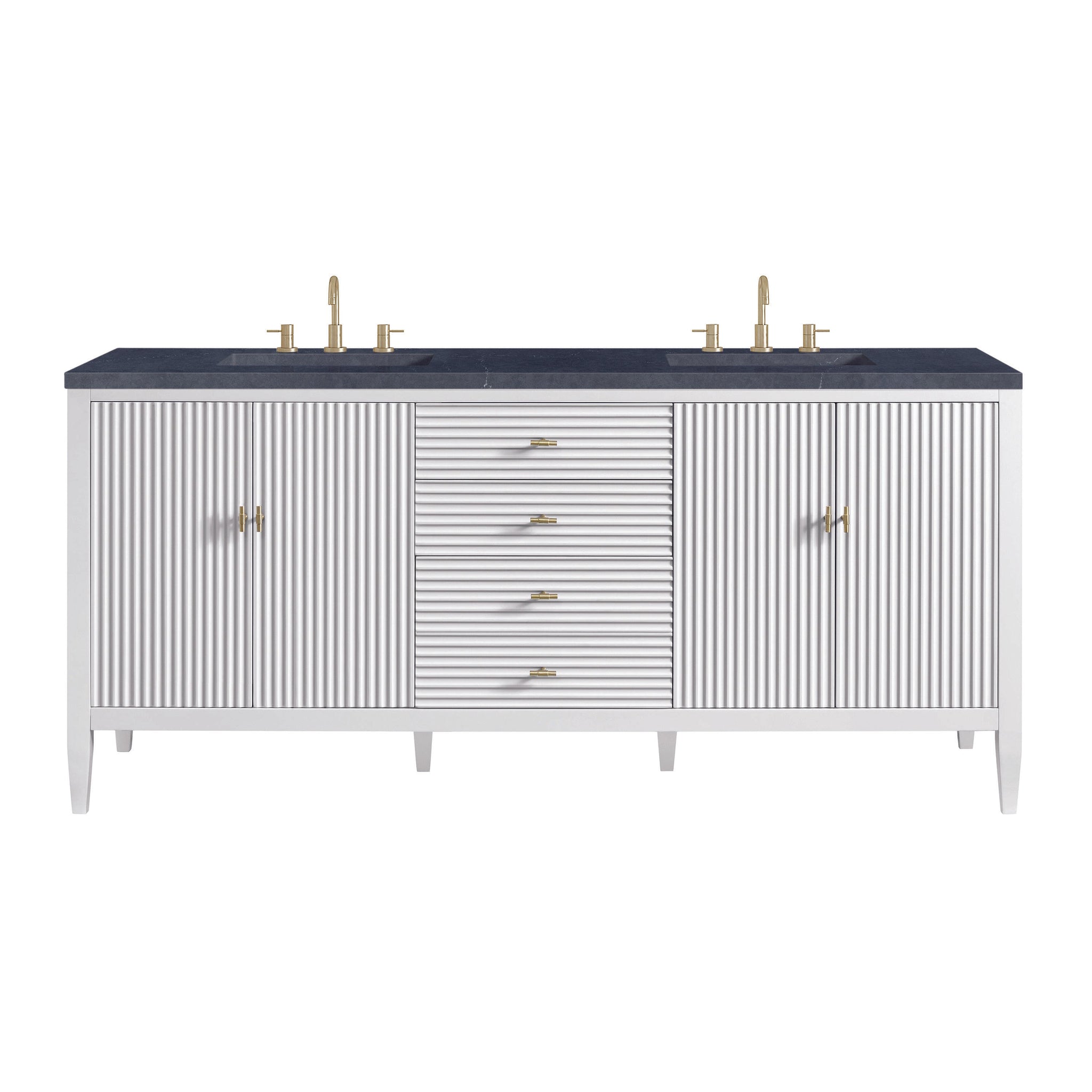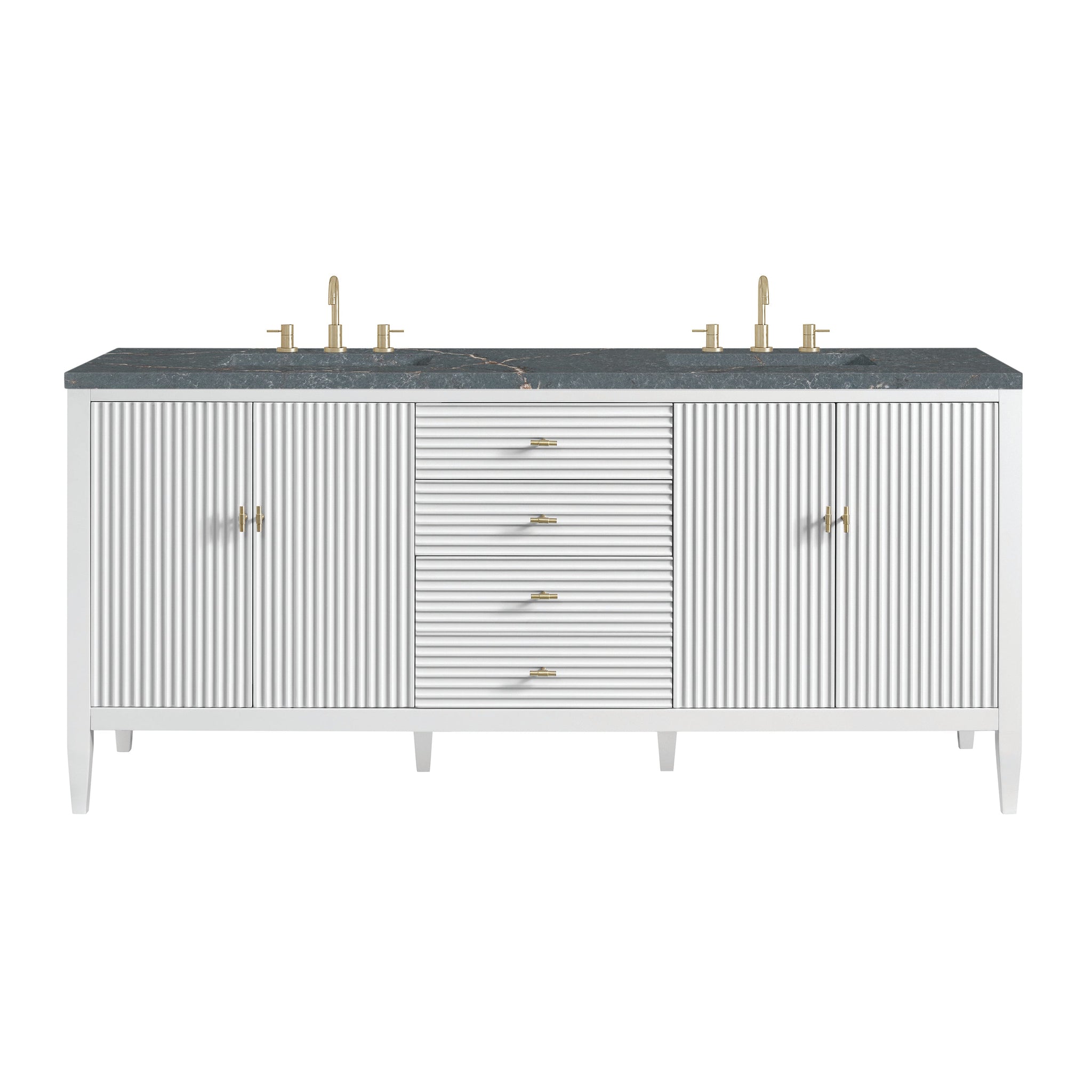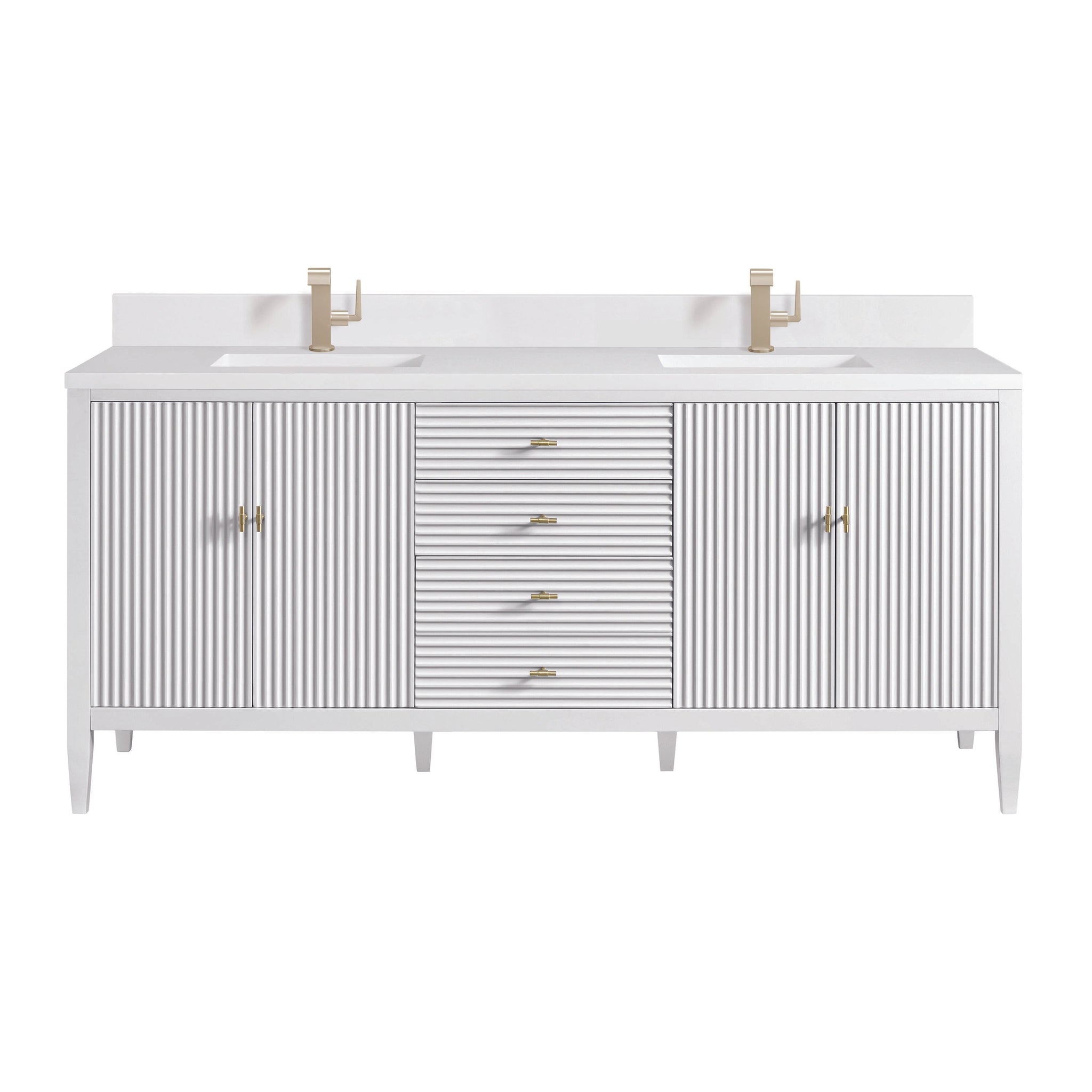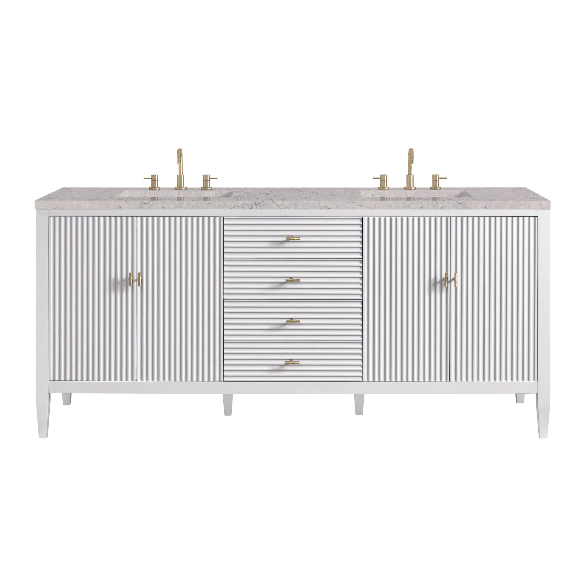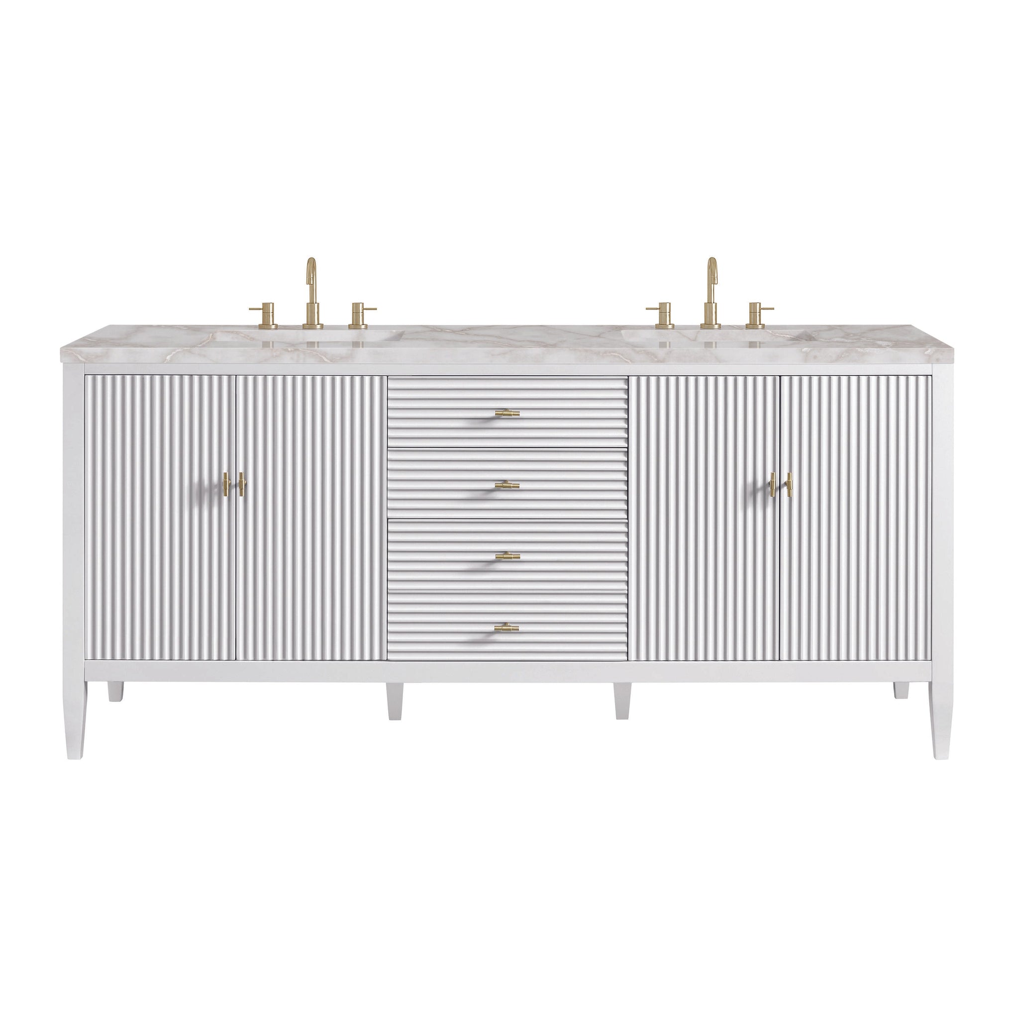 The 72" Myrrin Double Vanity features a minimalistic silhouette with fluted details, resulting in a blend of classical elegance and contemporary design. The deeply fluted panels run perpendicular on the doors and drawers, adding sophistication and visual interest to the design. Toggle-style knobs in Champagne Brass provide a luxe accent to the rich Bright White finish. The four-door cabinet opens to a spacious interior with a single shelf and convenient USB/Electric power outlets. 3 drawers lend additional storage. Choose one of our tops with undermount, rectangular sinks to perfectly complete this masterpiece.
