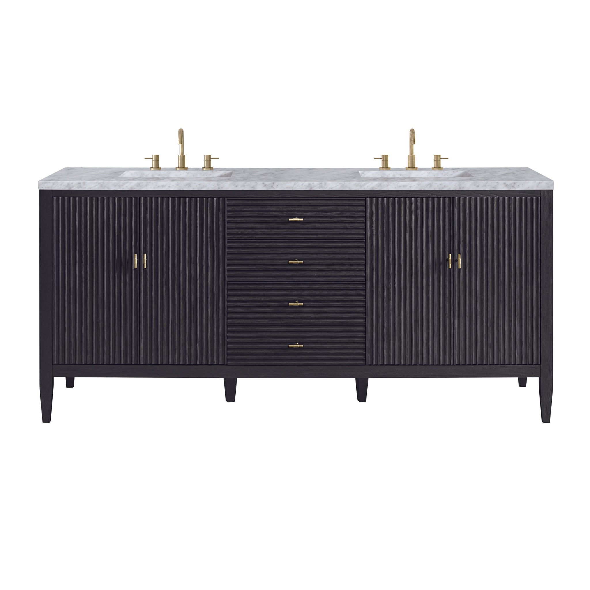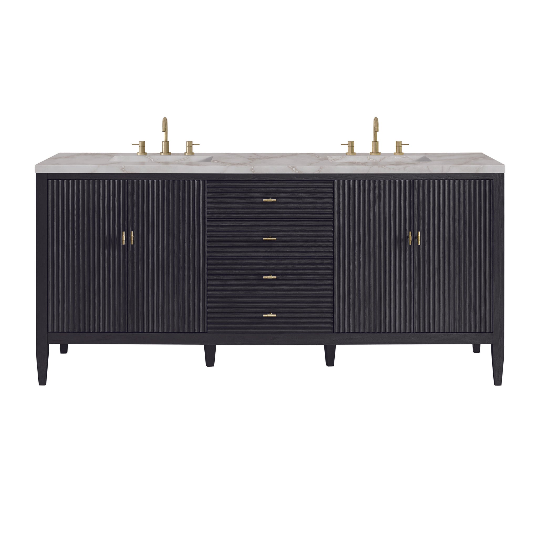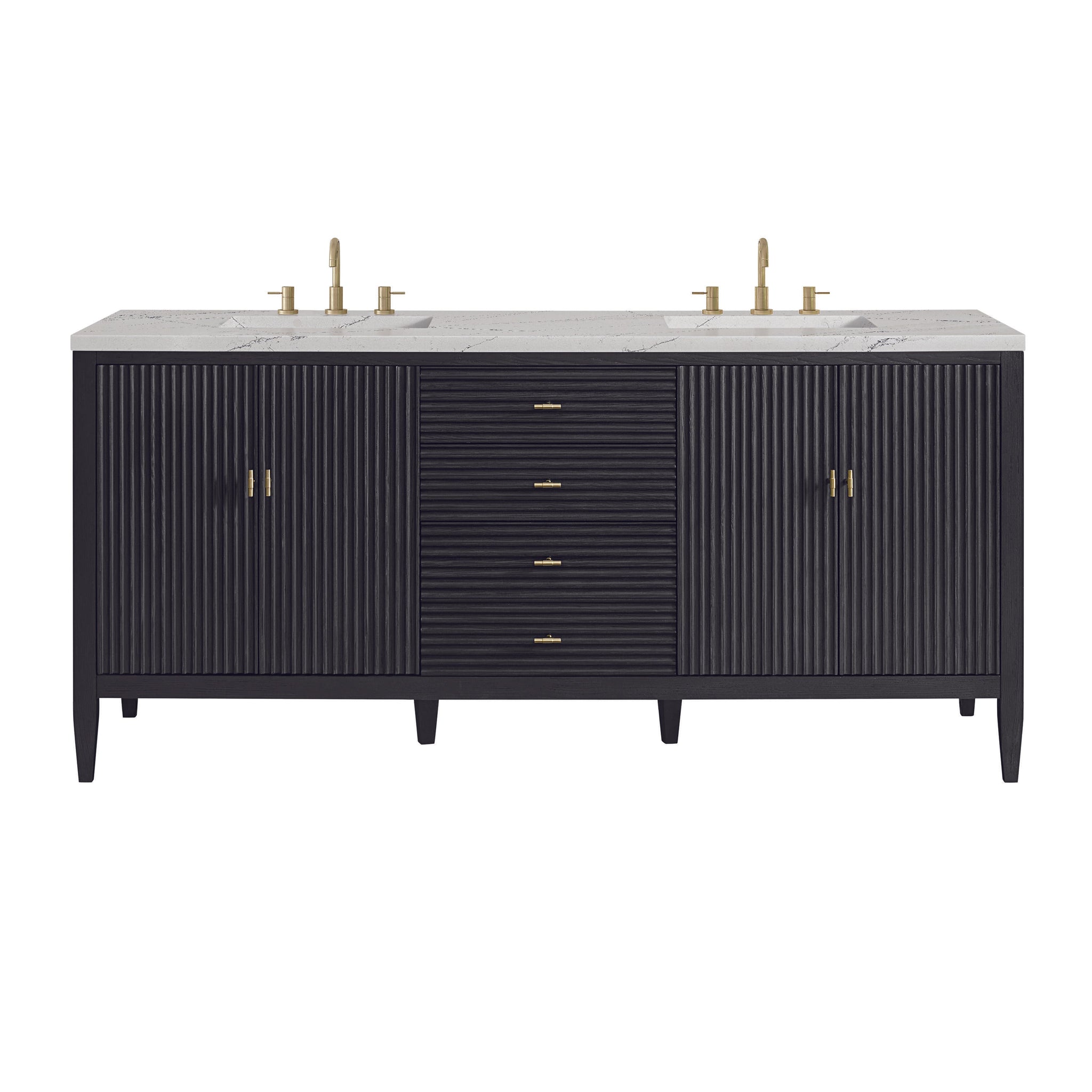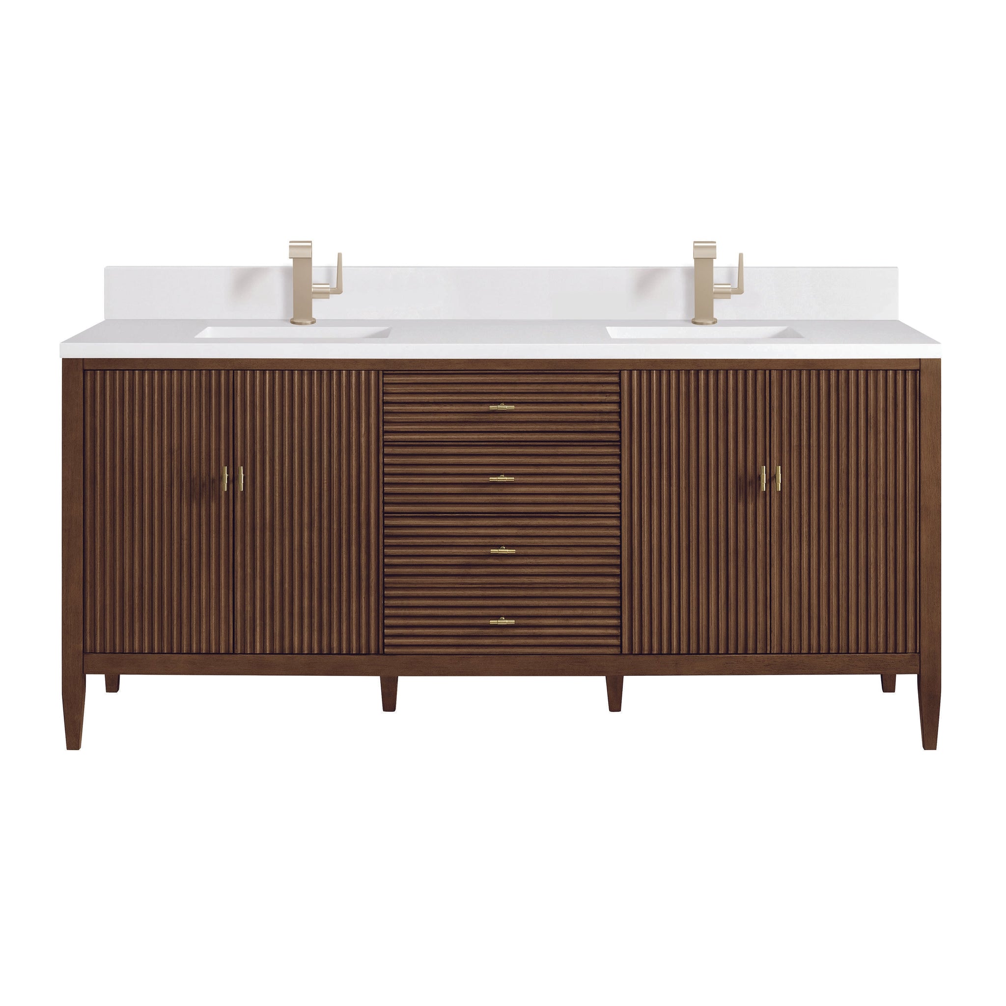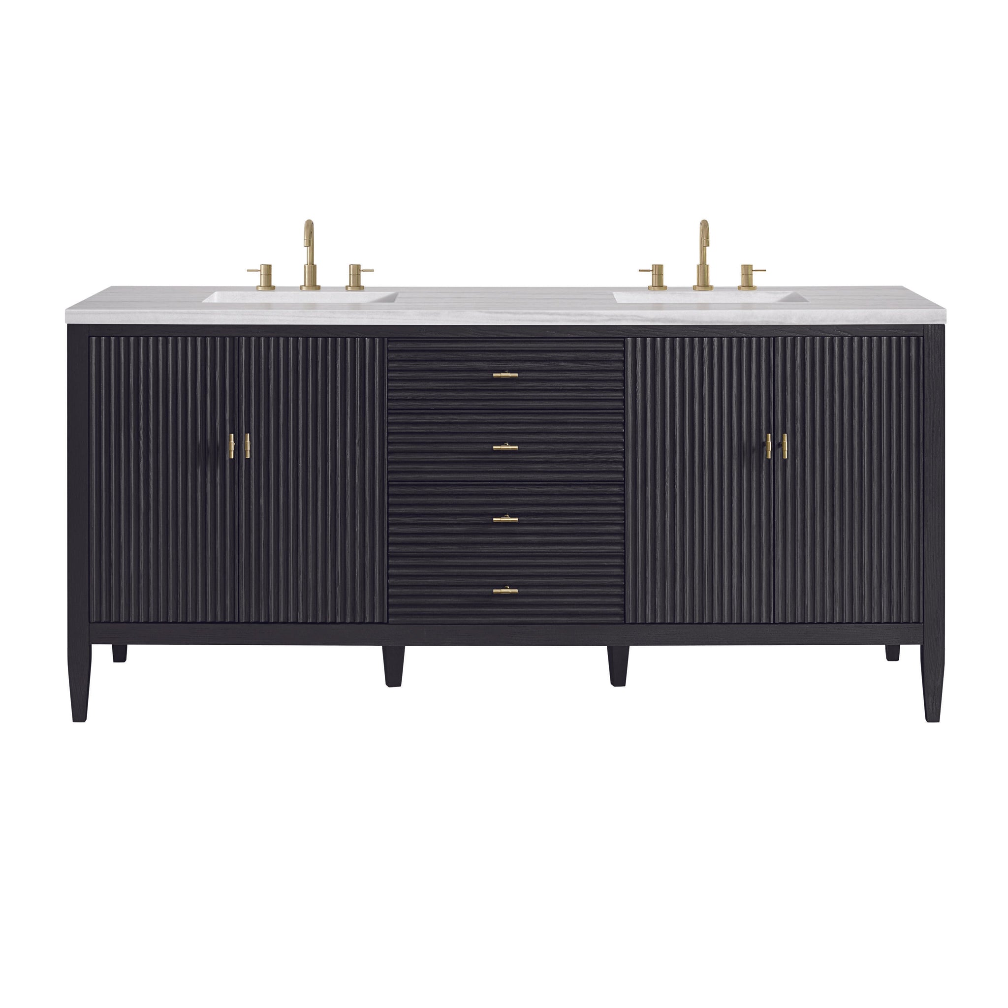The 72" Myrrin Double Vanity features a minimalistic silhouette with fluted details, resulting in a blend of classical elegance and contemporary design. The deeply fluted panels run perpendicular on the doors and drawers, adding sophistication and visual interest to the design. Toggle-style knobs in Champagne Brass provide a luxe accent to the rich Bright White finish. The four-door cabinet opens to a spacious interior with a single shelf and convenient USB/Electric power outlets. 3 drawers lend additional storage. Choose one of our tops with undermount, rectangular sinks to perfectly complete this masterpiece.
