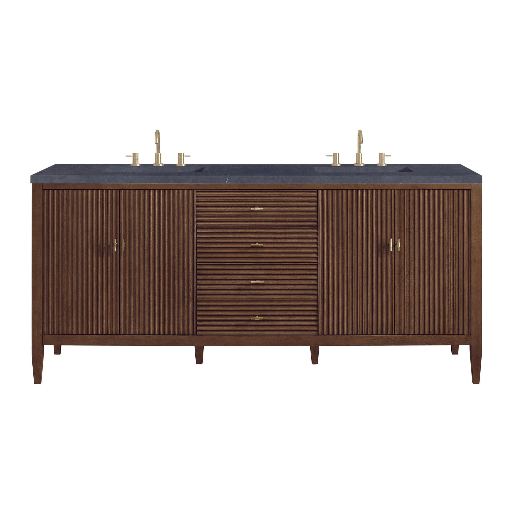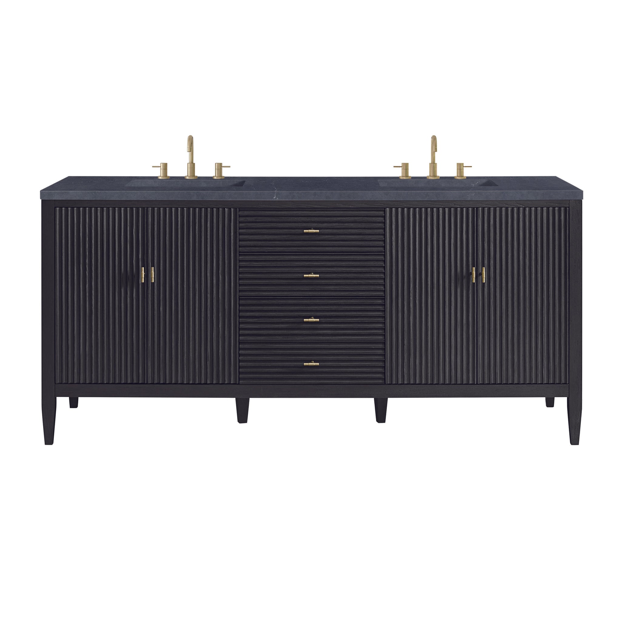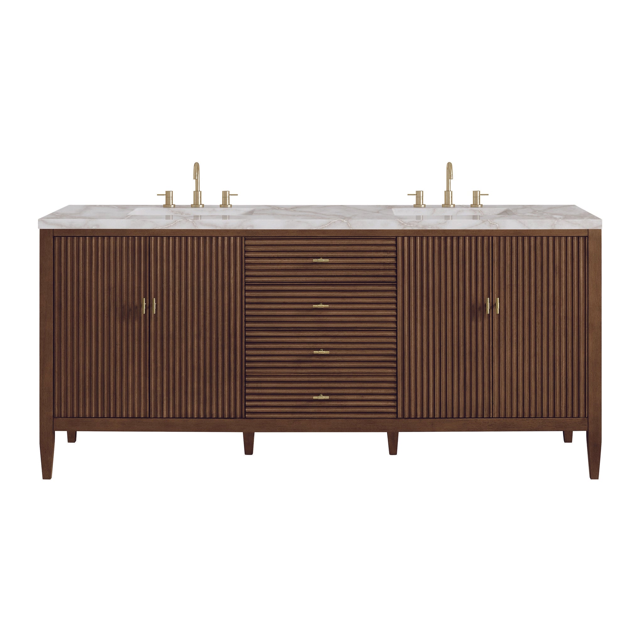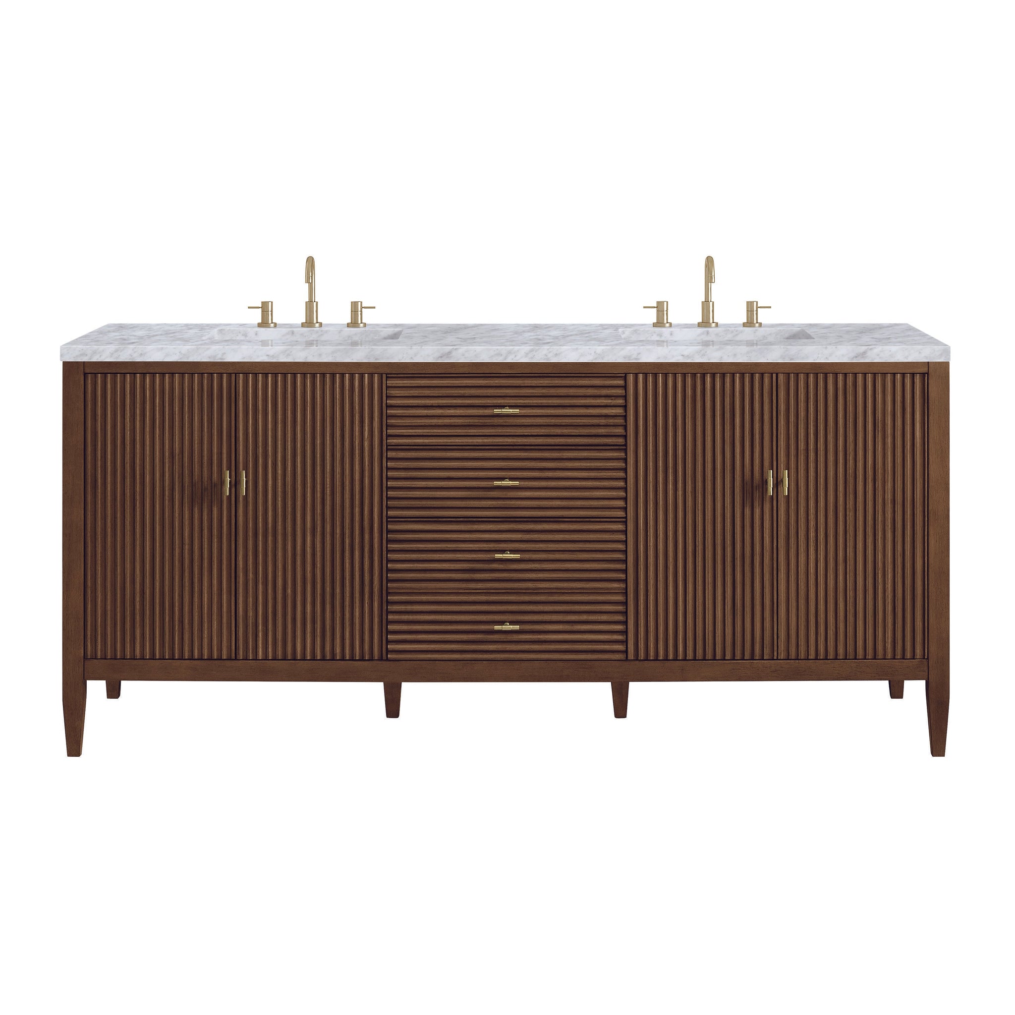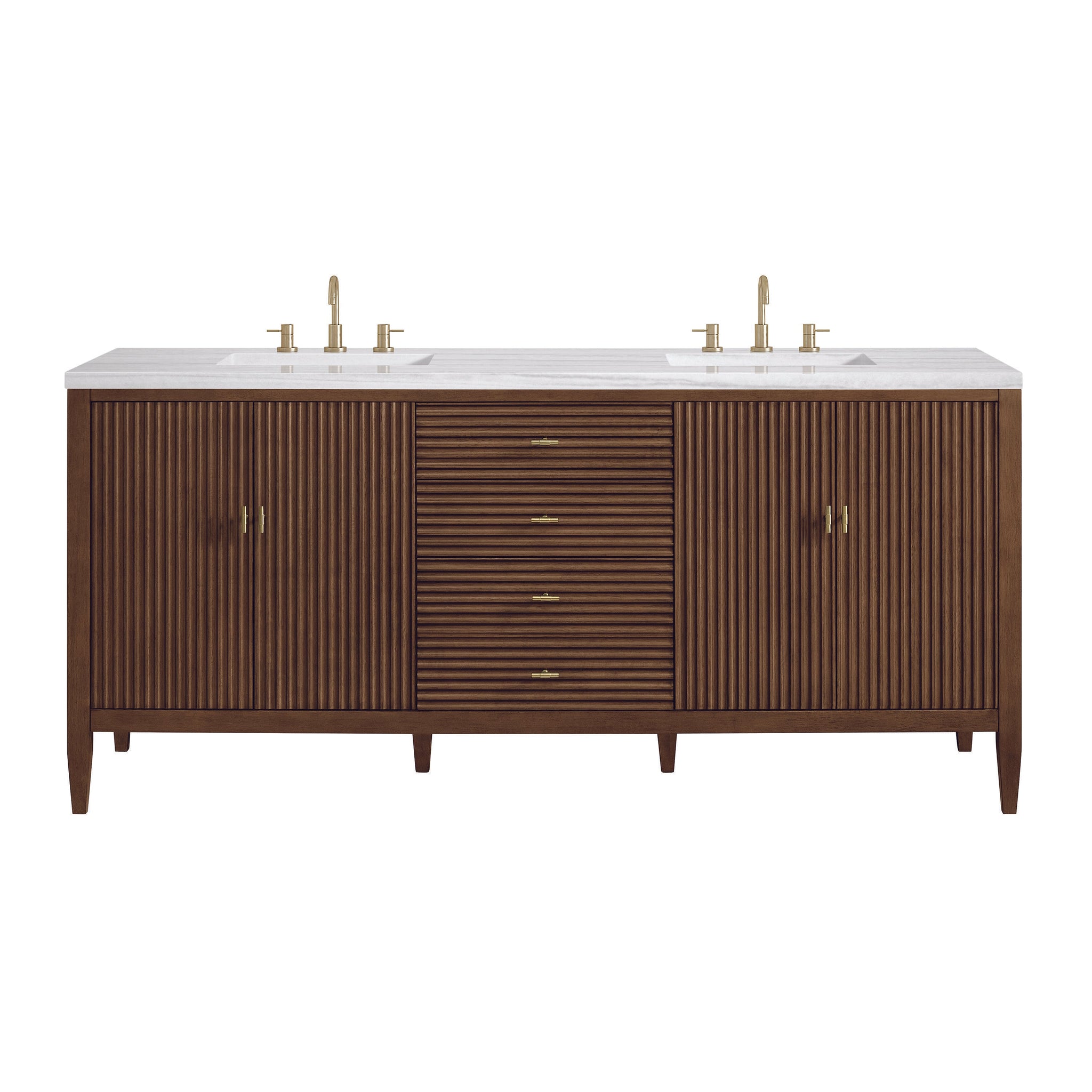The 72" Myrrin Double Vanity features a minimalistic silhouette with fluted details, resulting in a blend of classical elegance and contemporary design. The deeply fluted panels run perpendicular on the doors and drawers, adding sophistication and visual interest to the design. Toggle-style knobs in Champagne Brass provide a luxe accent to the rich Bright White finish. The four-door cabinet opens to a spacious interior with a single shelf and convenient USB/Electric power outlets. 3 drawers lend additional storage. Choose one of our tops with undermount, rectangular sinks to perfectly complete this masterpiece.
