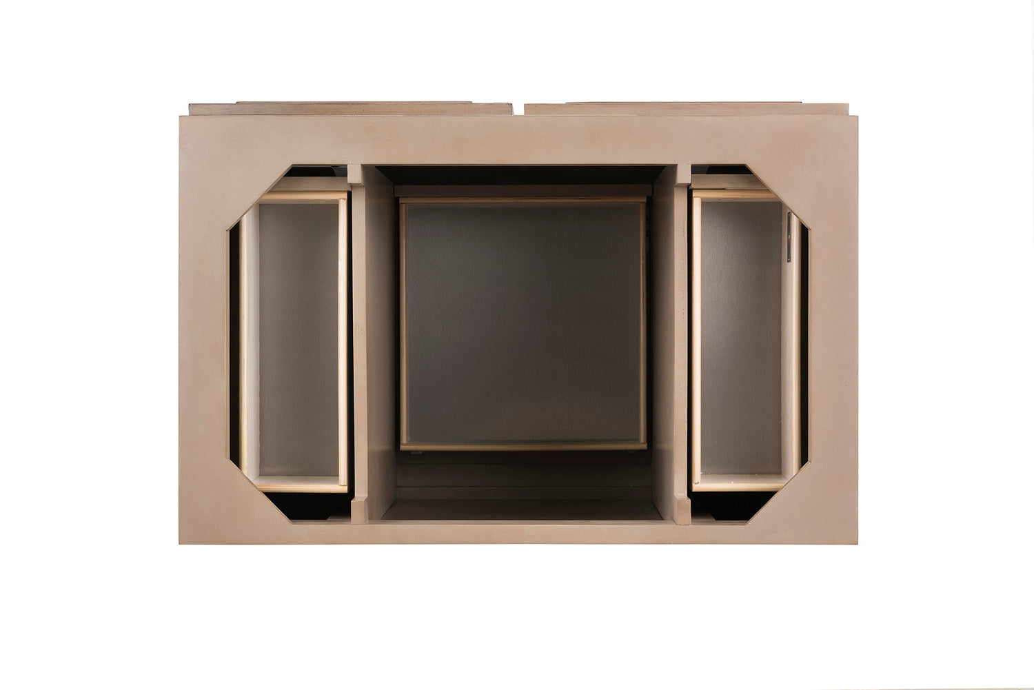 Drawer bottoms are lined with our signature brushed aluminum laminate