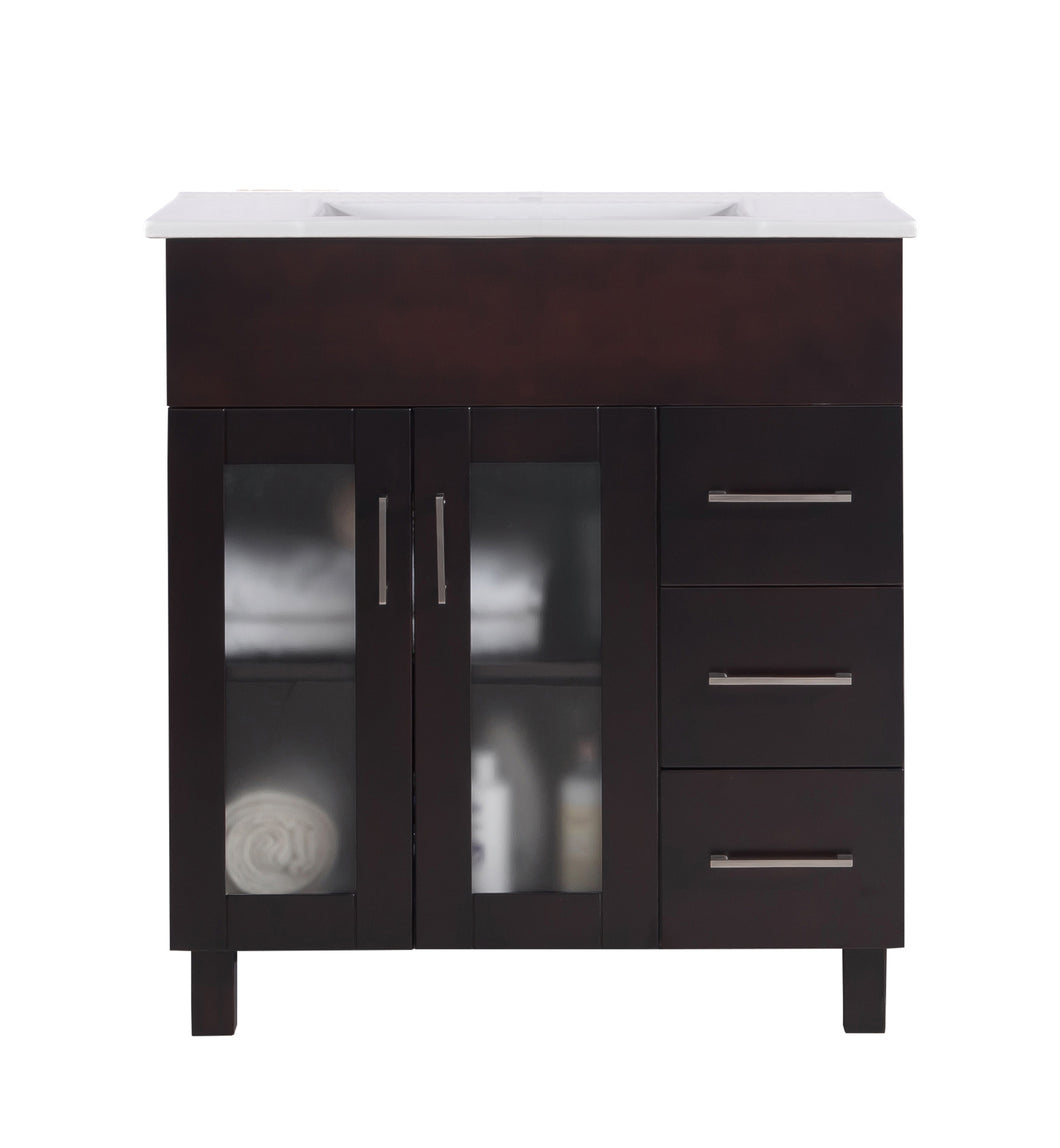 The Nova Collection offers a modern yet contemporary design without sacrificing functionality. This elegant collection offers 2 doors and many full extension drawers with soft closing hinges and rails, so you’ll never hear the door slam. The sleek ceramic basin has a modern rectangular seamless sink with an overflow. This stylish vanity has immaculate finish options including: White, Grey, Espresso, and Brown.