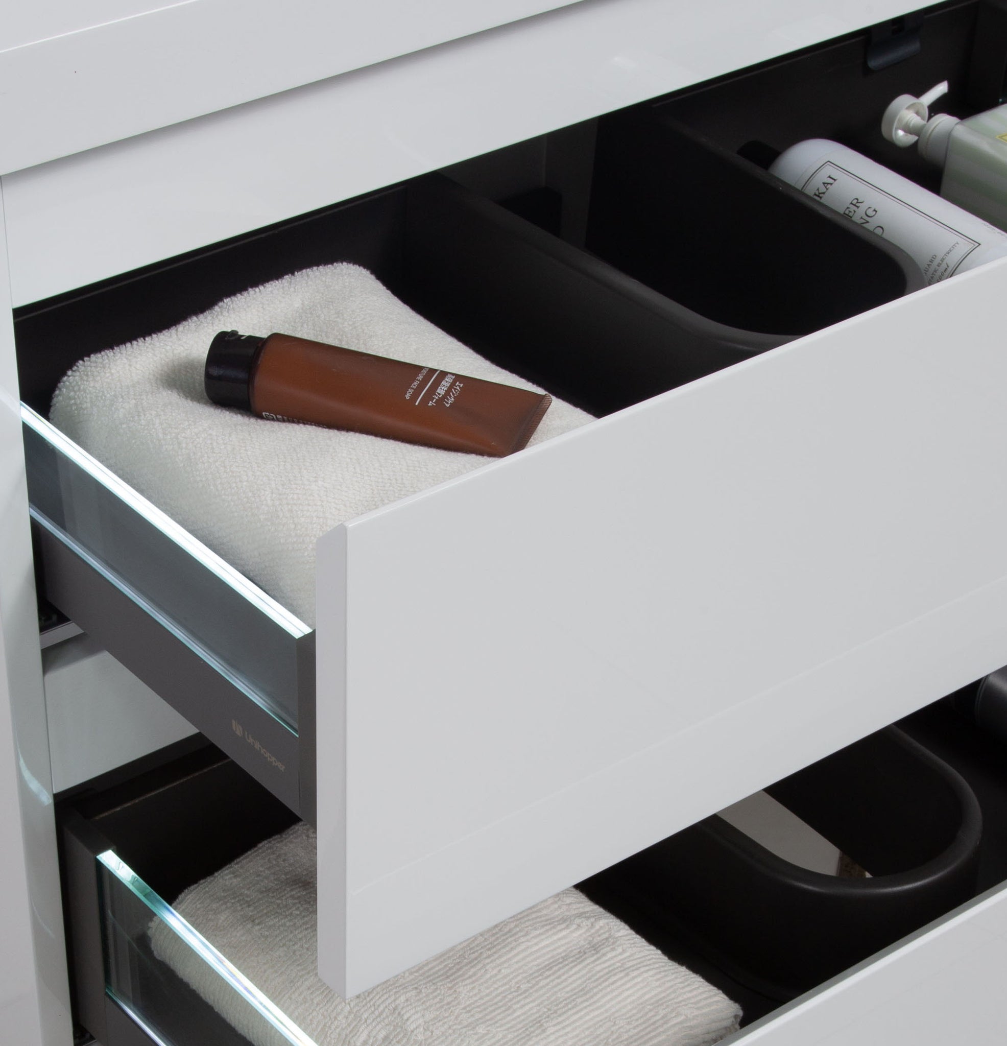The Aurora collection features drawers with illuminated glass sides that are reminiscent of the vibrant colors and shimmering light of the Aurora Borealis. These drawers not only provide ample storage space for your bathroom essentials but also create a soft, warm glow that adds to the overall ambiance of your bathroom. The collection's clean lines and minimalist design also reflect the simplicity and elegance of nature's light show.