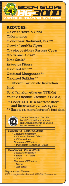 WI-BG3000C Replacement Cartridge Advanced protection includes particle reduction of .50 micron in size and larger with reduction in lead, VOCs and TTHMs. Provides filtration protection against off tastes and odors (including aesthetic chlorine and chloramines), cloudiness, rust, cysts (including Cyrptosporidium and Giardia), asbestos, bacteria, lime scale and bacteriostatic control. Certified for Sustainability by the Water Quality Association! (WQA S-803) Includes a filter change indicator. Features a quick-change RECYCLABLE cartridge Capacity: 450 gallons or 1-year 0.75 GPM flow rate Certifications: NSF 42, NSF 53 Dimensions: Width: 5 Height: 12 Meets "No Lead" standards for CA AB 1953 and VT Act 193