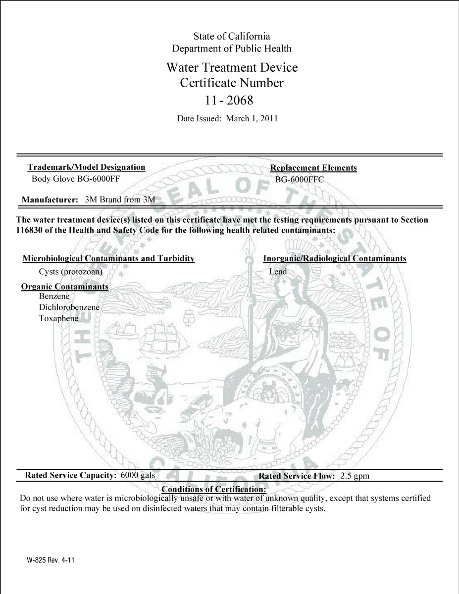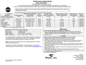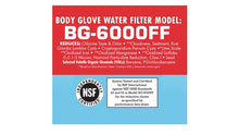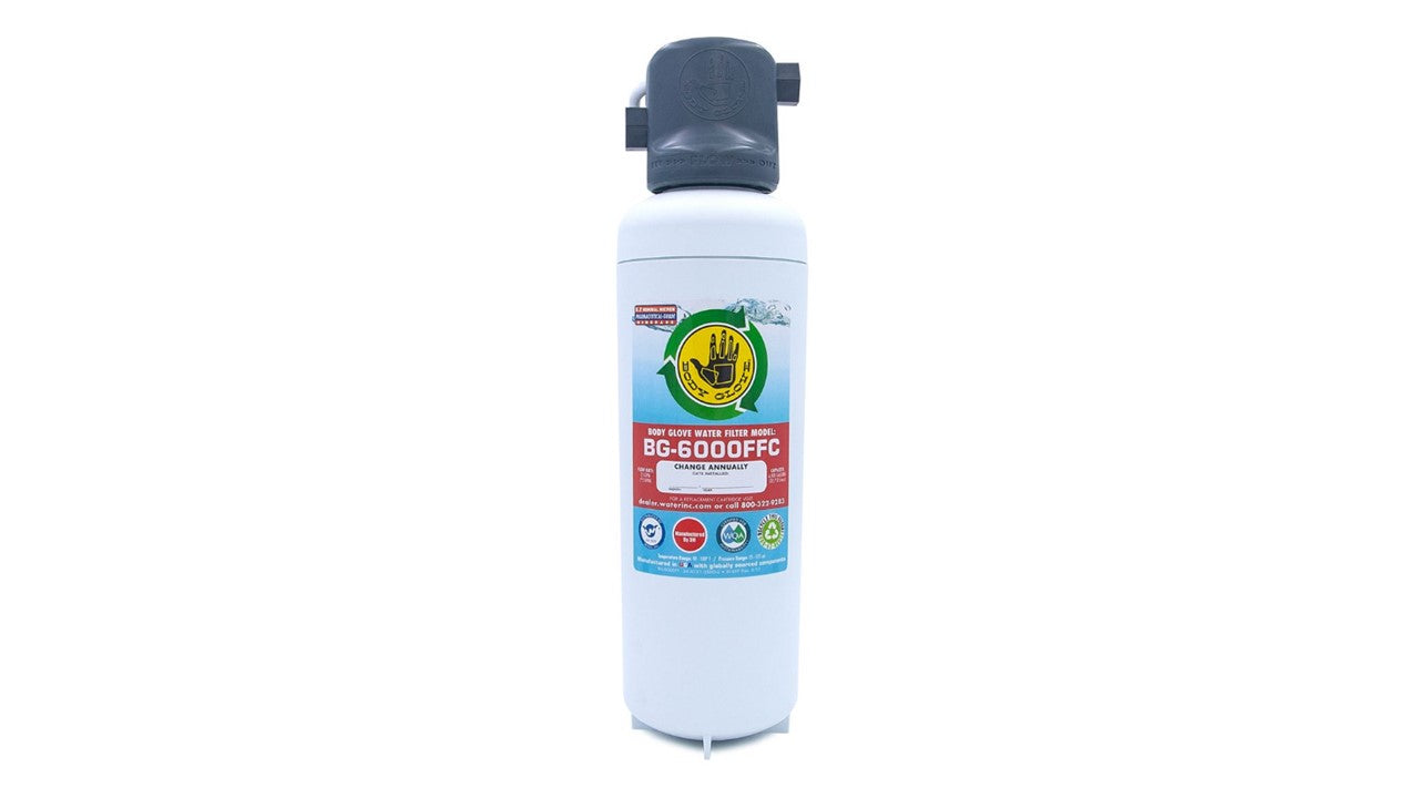 WI-BG6000FF Water Filtration System FULL FLOW Body Glove Filtration System. Advanced water filtration at a high flow rate application. For installation with full-flow faucets such as pot-fillers, prep sinks, master bath, home spa, children or guest bath. Also great for bar sinks and ice makers. Provides filtration protection against off tastes and odors (including aesthetic chlorine and chloramines), dirt and cloudiness, mold and algae, oxidized iron, oxidized manganese, oxidized sulfides, lead, cysts (giardia lamblia, entamoeba histolytica and cryptosporidium parvum), and selected VOC reduction. Features a recyclable cartridge and filter change indicator. NSF 42: Nominal Particulate, Class 1; Chlorine reduction, Taste and Odor reduction. NSF 53: Cysts, Lead, Benzene, P-Dichlorobenzene. CA listed, meets CA AB 1953 and CA Prop 65 standards. Capacity: 6000 gallons or 1-year 2.5 GPM flow rate Utilizes Existing Faucet high flow rate and a large capacity Dimensions: Width: 4.50