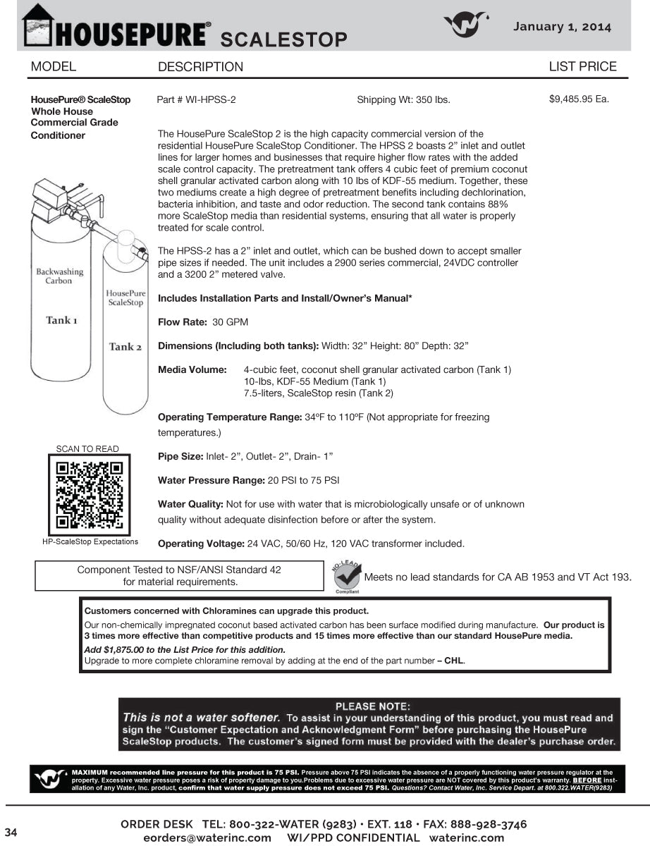 Water Inc WI-HPSS-2 HousePure ScaleStop Whole House Commercial Grade Conditoner The HousePure ScaleStop 2 is the high capacity commercial version of the residential HousePure ScaleStop Conditioner. The HPSS 2 boasts 2 inlet and outlet lines for larger homes and businesses that require higher ow rates with the added scale control capacity. The pretreatment tank offers 4 cubic feet of premium coconut shell granular activated carbon along with 10 lbs of KDF-55 medium. Together, these two mediums create a high degree of pretreatment bene ts including dechlorination, bacteria inhibition, and taste and odor reduction. The second tank contains 88% more ScaleStop media than residential systems, ensuring that all water is properly treated for scale control. The HPSS-2 has a 2 inlet and outlet, which can be bushed down to accept smaller pipe sizes if needed. The unit includes a 2900 series commercial, 24VDC controller and a 3200 2 metered valve. Includes Installation Parts and Install/Owners