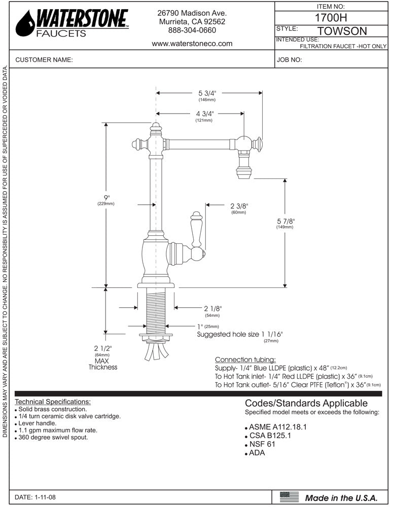 Waterstone 1700H Towson Hot Only Filtration Faucet - Lever Handle