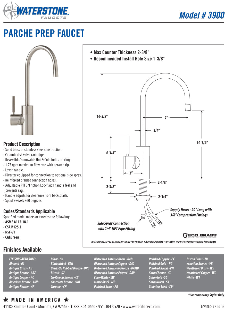 A classic contemporary kitchen faucet design. A full size kitchen faucet with shorter spout reach, the Parche Prep Faucet is a ideal solution for any kitchen island or wet bar sink. The Parche's simple, modern design lives up to the high standards you expect from Waterstone. Made with a elegant C-spout with a 7" reach and single handle. Lever handle can be easily mounted and positioned with handle in front, right or left. Want to add matching accessories The Parche Prep Faucet comes with a built-in diverter for connection to optional side sink sprayer. Made from solid brass or stainless steel construction for a lifetime of durability. availablee in 32 elegant finishes and stainless steel. Compatible with reverse osmosis filtration systems. Parche's state-of-the-art look and functionality will enhance any cooking experience in your contemporary kitchen
