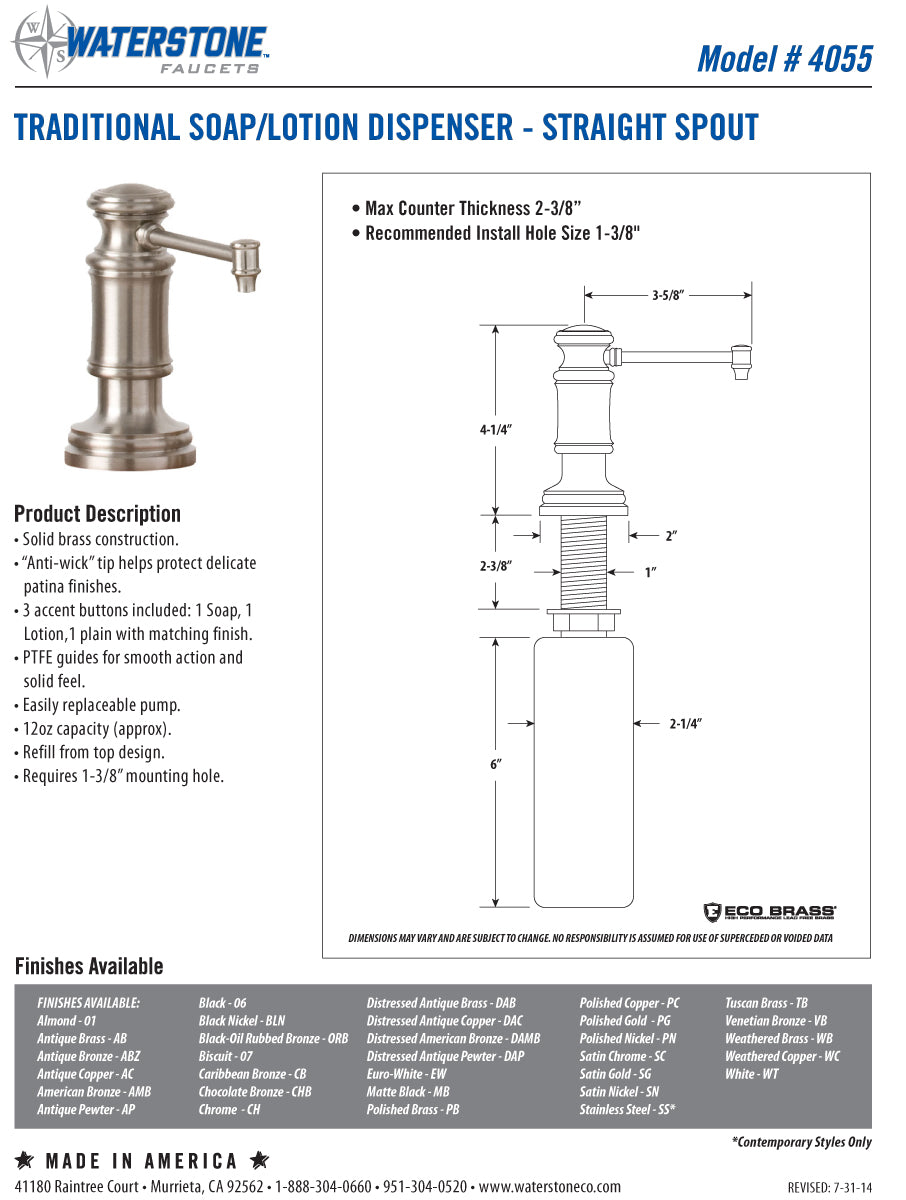 Waterstone 4055 Traditional Soap Lotion Dispenser Straight Spout