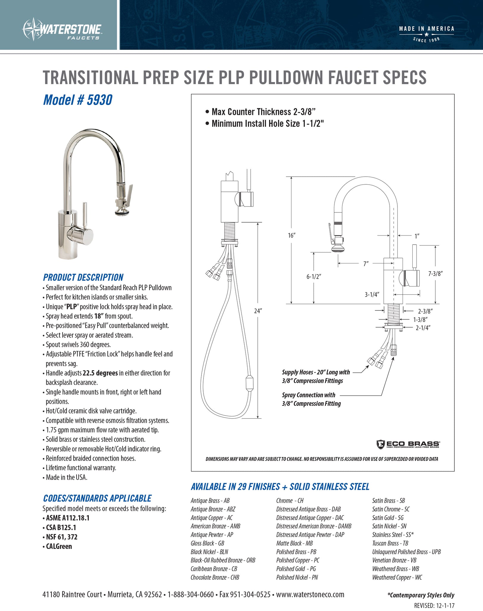 Waterstone 5930 Transitional Prep Size Pulldown Faucet