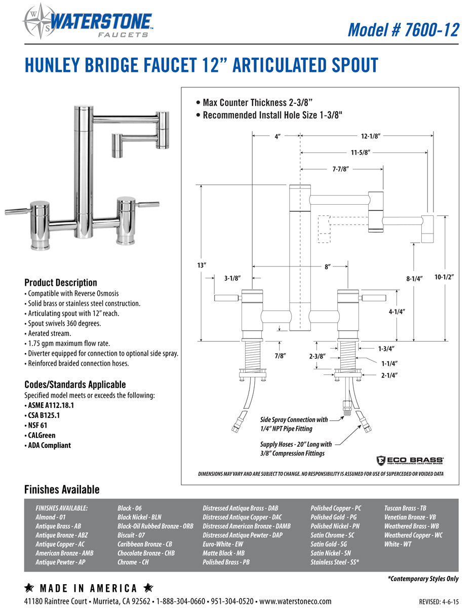 ,7600-12-CH,7600-12-SC,7600-12-AB,7600-12-ABZ,7600-12-ORB,7600-12-TB,7600-12-AC,7600-12-BLN,7600-12-DAC,7600-12-DAB,7600-12-AMB,7600-12-DAMB,7600-12-CB,7600-12-PC,7600-12-AP,7600-12-DAP,7600-12-CHB,7600-12-MB,7600-12-PN,7600-12-SN,7600-12-PB,7600-12-SS,7600-12-SB,7600-12-CLZ,7600-12-PG,7600-12-SG,7600-12-UPB,7600-12-MB-CLZ,7600-12-GR,7600-12-MW,7600-12-MAC,7600-12-MAB,7600-12-MAP,7600-12-SB-MB,7600-12-CLZ-MB,7600-12-MB-PN,7600-12-MB-SN,7600-12-MB-SB,7600-12-MB-CH,7600-12-MB-SS,7600-12-CD,7600-12-MB-CD,7600-12-CD-MB|,Polished Chrome,Satin Chrome,Antique Brass,Antique Bronze,Oil Rubbed Bronze,Tuscan Brass,Antique Copper,Black Nickel,Distressed Antique Copper,Distressed Antique Brass,American Bronze,Distressed American Bronze,Caribbean Bronze,Polished Copper,Antique Pewter,Distressed Antique Pewter,Chocolate Bronze,Matte Black,Polished Nickel,Satin Nickel,Polished Brass,Stainless Steel,Satin Brass,Classic Bronze,Polished Gold,Satin Gold,Unlacquered Polished Brass,Matte Black & Classic Bronze,Graphite,Matte White,Matte Antique Copper,Matte Antique Brass,Matte Antique Pewter,Satin Brass & Matte Black,Classic Bronze & Matte Black,Matte Black & Polished Nickel,Matte Black & Satin Nickel,Matte Black & Satin Brass,Matte Black & Chrome,Matte Black & Stainless Steel,Chardonnay,Matte Black & Chardonnay,Chardonnay & Matte Black|,3336.00,3602.00,4306.00,4306.00,4306.00,4306.00,4306.00,3602.00,4306.00,4306.00,4306.00,4306.00,4306.00,4306.00,4306.00,4306.00,3602.00,3602.00,3336.00,3602.00,3602.00,4422.00,3602.00,3602.00,5598.00,5598.00,3336.00,3635.50,3602.00,3602.00,4306.00,4306.00,4306.00,3635.50,3635.50,3635.50,3635.50,3635.50,3635.50,4864.20,3602.00,3635.50,3635.50|,2502.00,2701.50,3229.50,3229.50,3229.50,3229.50,3229.50,2701.50,3229.50,3229.50,3229.50,3229.50,3229.50,3229.50,3229.50,3229.50,2701.50,2701.50,2502.00,2701.50,2701.50,3316.50,2701.50,2701.50,4198.50,4198.50,2502.00,2726.63,2701.50,2701.50,3229.50,3229.50,3229.50,2726.63,2726.63,2726.63,2726.63,2726.63,2726.63,3648.15,2701.50,2726.63,2726.63|,0,0,0,0,0,0,0,0,0,0,0,0,0,0,0,0,0,0,0,0,0,0,0,0,0,0,0,0,0,0,0,0|,28997582520425,28997582585961,28997582651497,28997582717033,28997582782569,28997582815337,28997582946409,28997583011945,28997583077481,28997583143017,28997583208553,28997583274089,28997583339625,28997583405161,28997583470697,28997583503465,28997583700073,28997583732841,28997583798377,28997583863913,28997583929449,28997583962217,28997583994985,28997584027753,28997584093289,28997584126057,28997584158825,41001397584063,42237503766719,40782482833599,40782482931903,40782482899135,40782483095743,41001397780671,41001397682367,41001397649599,41001397616831,41001397715135,41001397747903,41001397551295,42482119770303,42482119835839,42482119803071|,42,42,42,42,42,42,42,42,42,42,42,42,42,42,42,42,42,42,42,42,42,42,42,42,42,42,42,42,42,42,42,42,42,42,42,42,42,42,42,42,42,42,42|,7600-12-CH,7600-12-SC,7600-12-AB,7600-12-ABZ,7600-12-ORB,7600-12-TB,7600-12-AC,7600-12-BLN,7600-12-DAC,7600-12-DAB,7600-12-AMB,7600-12-DAMB,7600-12-CB,7600-12-PC,7600-12-AP,7600-12-DAP,7600-12-CHB,7600-12-MB,7600-12-PN,7600-12-SN,7600-12-PB,7600-12-SS,7600-12-SB,7600-12-CLZ,7600-12-PG,7600-12-SG,7600-12-UPB,7600-12-MB-CLZ,7600-12-GR,7600-12-MW,7600-12-MAC,7600-12-MAB,7600-12-MAP,7600-12-SB-MB,7600-12-CLZ-MB,7600-12-MB-PN,7600-12-MB-SN,7600-12-MB-SB,7600-12-MB-CH,7600-12-MB-SS,7600-12-CD,7600-12-MB-CD,7600-12-CD-MB