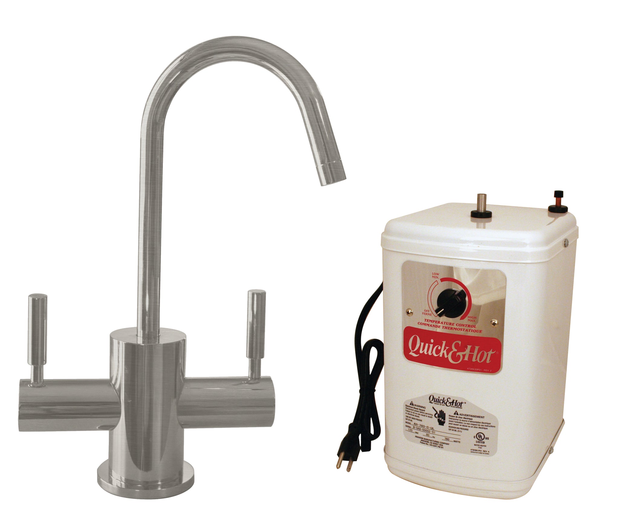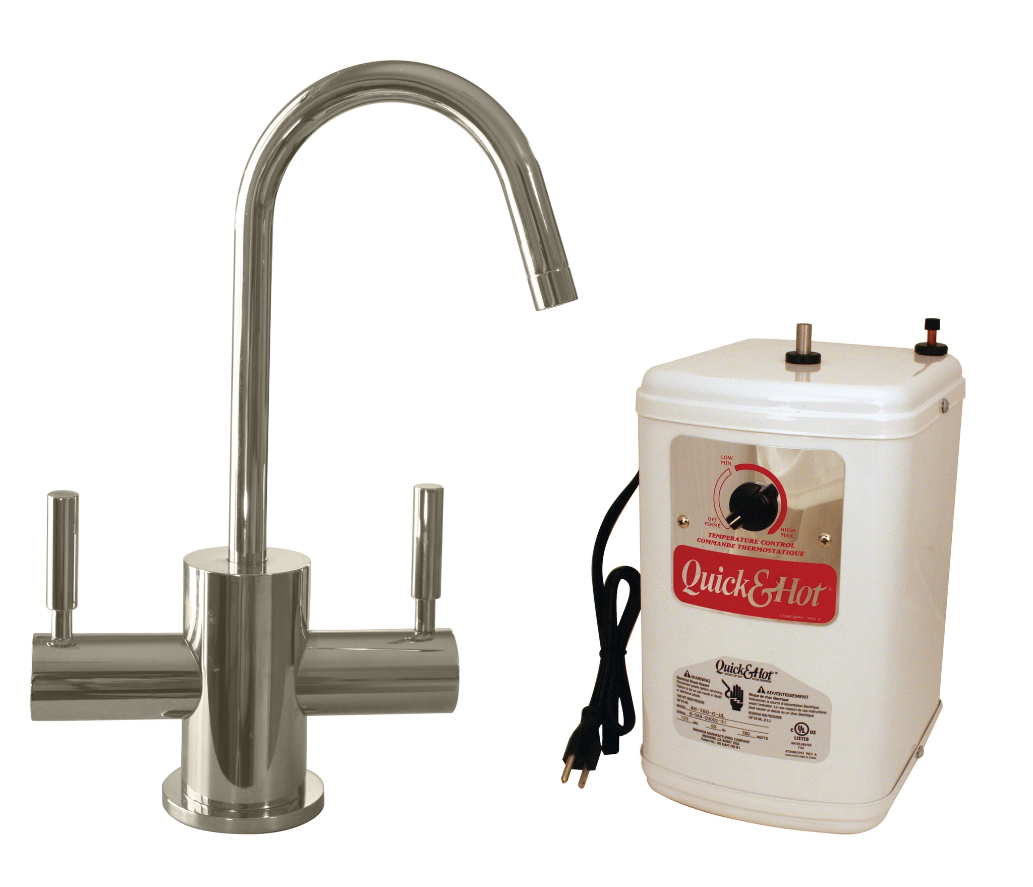 The Westbrass 2-handle Contemporary instant hot and cold water dispenser with hot water tank offers a single-handle design. This includes a high-arc, extended spout that provides great sink clearance. Hot water supply can be filtered for a pure, clean taste (filter sold separately). A white hot water tank is included with the faucet. The faucet is designed for single-hole installation (mounting materials included).