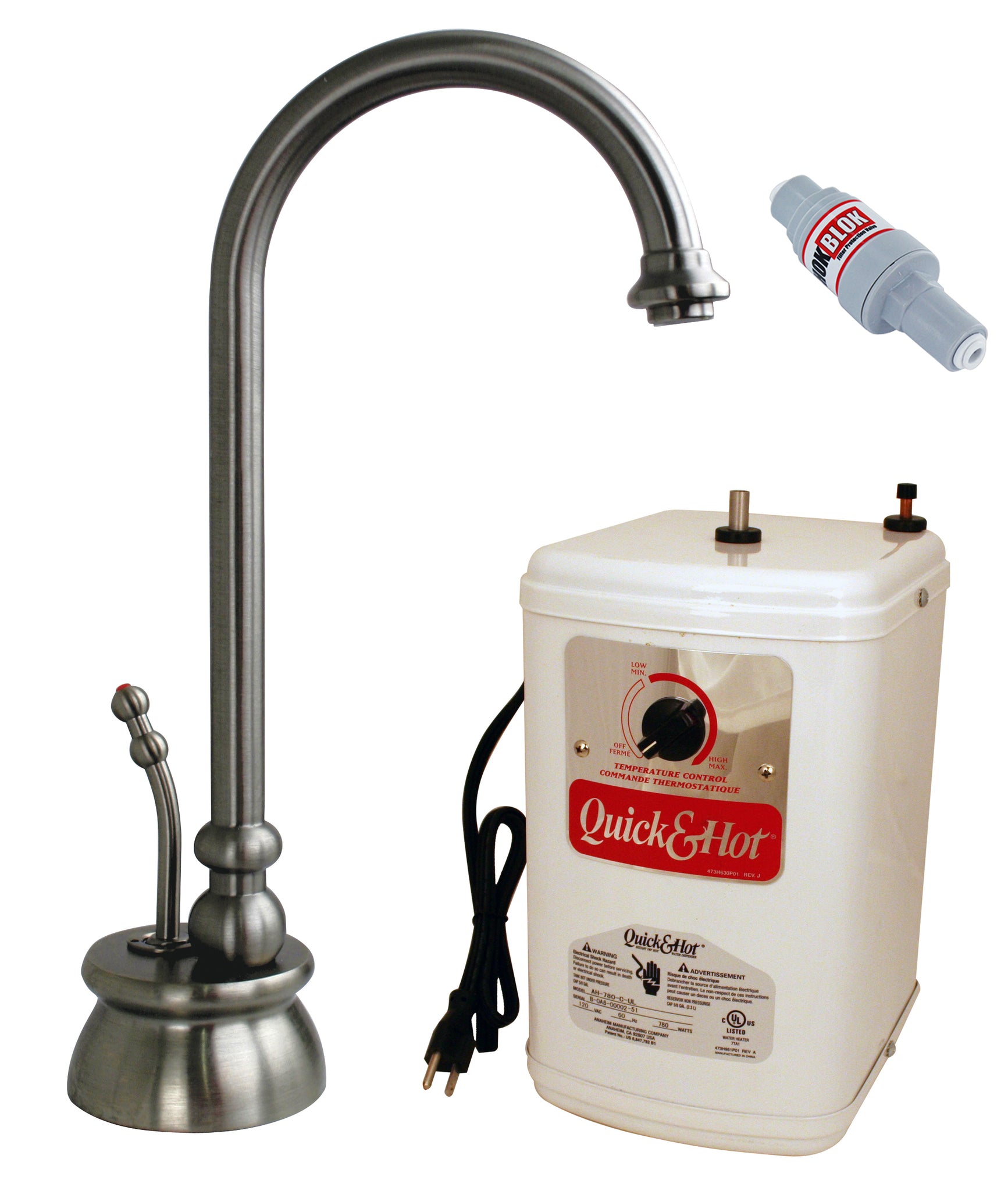 The Westbrass Calorah Single-Handle Hot Water Dispenser Faucet Kit with tank, offers quick and easy water control and its single handle automatically turns off hot water for your safety. The faucet features a high-arc spout for an attractive appearance. A QHT 1300W instant hot water tank, plugs into 120V and is included with this faucet. Mounting materials are included for convenient, single-hole installation.